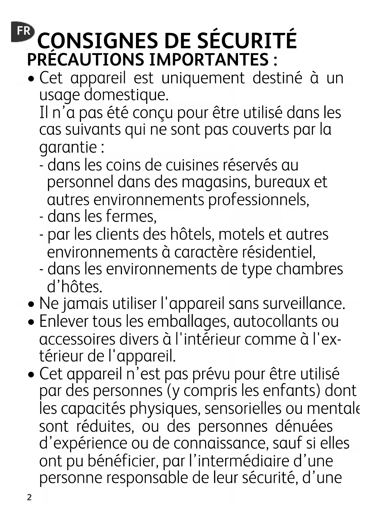 - Cet appareil est uniquement destiné à un usage domestique. Il n’a pas été conçu pour être utilisé dans les cas suivants qui ne sont pas couverts par la garantie : - dans les coins de cuisines réservés au personnel dans des magasins, bureaux et autres environnements professionnels, - dans les fermes, - par les clients des hôtels, motels et autres environnements à caractère résidentiel, - dans les environnements de type chambres d’hôtes.
