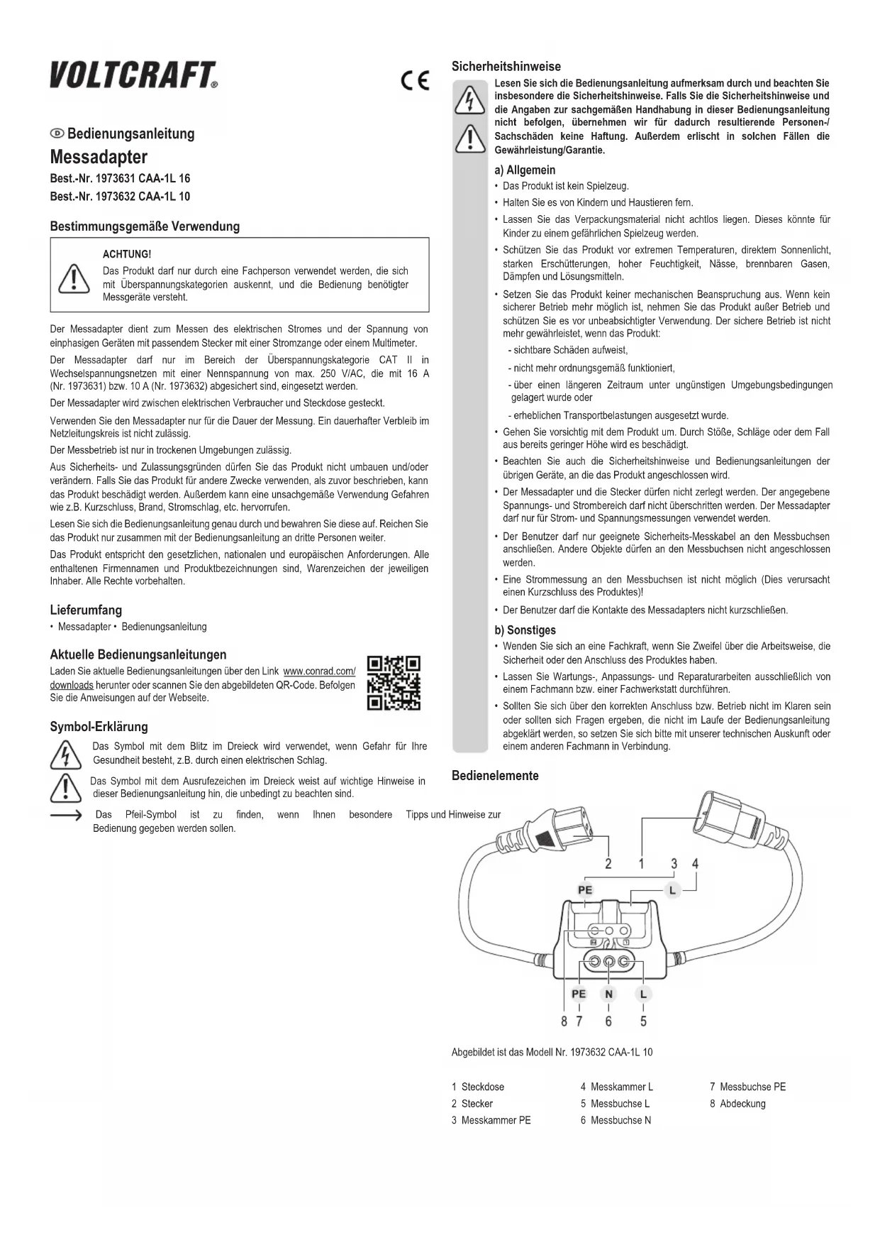 - Encasdedouterelatifauraccordementcorrectetàl'utilisationdel’appareil,ou lorsque vous avez des questions pour lesquelles vous ne trouvez aucune réponse dans le présent mode d’emploi, contactez notre service technique ou un autre spécialiste. Éléments de fonctionnement L’illustration représente le modèle nº 1973632 CAA-1L 10 1 Prise 2 Connecteurmâle 3 Chambre de mesure PE 4 Chambre de mesure L 5 Borne de mesure L 6 Borne de mesure N 7 Borne de mesure PE 8 Couvercle Mode d’emploi Adaptateur de mesure Nº de commande 1973631 CAA-1L 16 Nº de commande 1973632 CAA-1L 10 Utilisation prévue ATTENTION ! Le produit doit être utilisé uniquement par un professionnel qui maîtrise les catégoriesdesurtensionetl'utilisationdel’appareildemesurerequis. L’adaptateur de mesure sert à mesurer le courant électrique et la tension des appareils monophasésavecunconnecteurmâleappropriéaumoyend’unepinceampèremétriqueou d'unmultimètre. L’adaptateur de mesure doit être utilisé uniquement dans les zones correspondant à la catégorie de surtension CAT II dans les réseaux alternatifs avec une tension nominale de 250 V/CA max., protégés au moyen d’un fusible de 16 A (nº 1973631) ou 10 A (nº 1973632). L’adaptateurdemesures'insèreentreleconsommateurélectriqueetlaprise. Utilisezl'adaptateuràmesureseulementpendantladuréedelamesure.Ilestinterditdele laisser branché dans le circuit du réseau pendant longtemps. Le mode de mesure doit être utilisé uniquement dans des environnements secs. Pourdesraisonsdesécuritéetd’homologation,toutetransformationet/oumodicationdu produitestinterdite.Sivousutilisezleproduitàd’autresnsquecellesdécritesprécédemment, vous risquez de l’endommager. Par ailleurs, une utilisation incorrecte peut être source de dangers tels que les courts-circuits, les incendies, l’électrocution. Lisez attentivement le mode d’emploi et conservez-le. Ne transmettez le produit à un tiers qu’accompagné de son mode d’emploi. Le produit est conforme aux exigences légales européennes et nationales en vigueur. Tous les noms d’entreprises et toutes les appellations de produits indiqués sont des marques déposées de leurs propriétaires respectifs. Tous droits réservés. Contenu d’emballage