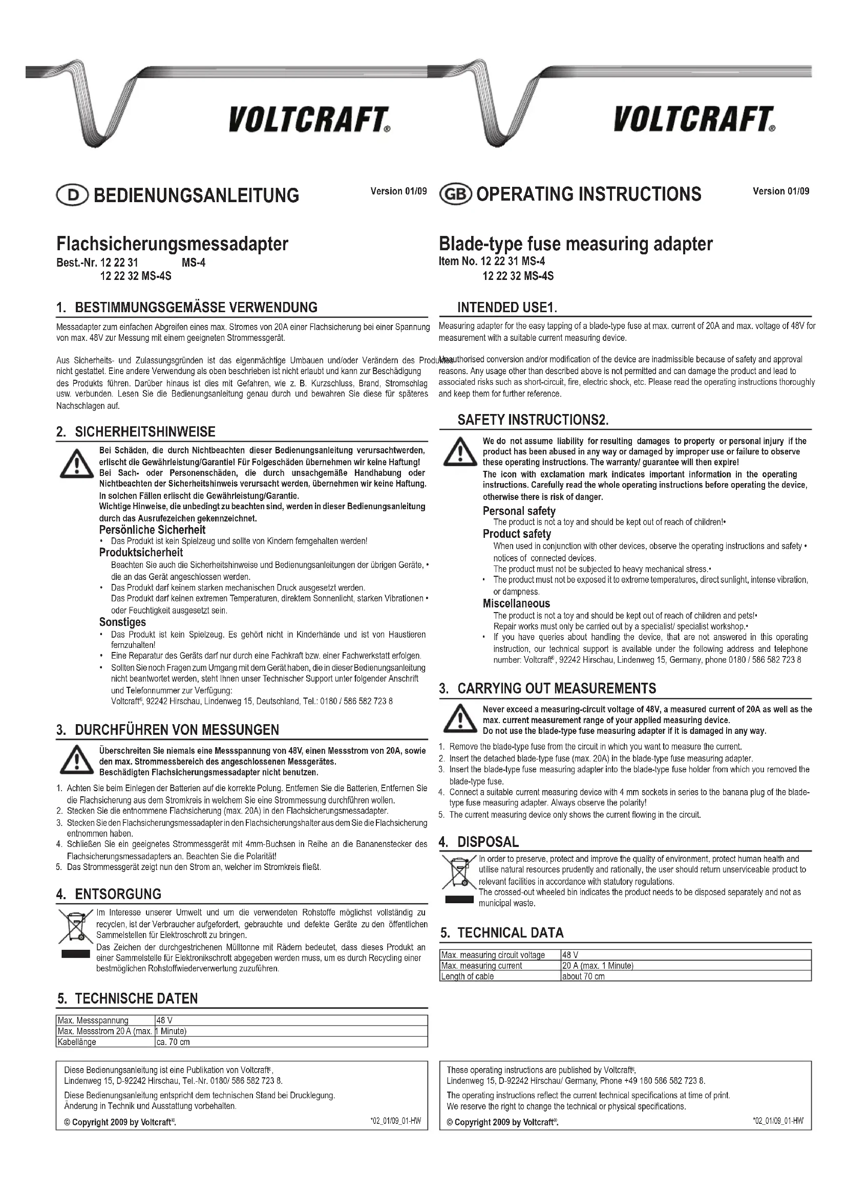 Version 01/09 Adaptateur de mesure pour fusibles plats Nº de commande 12 22 31 MS-4 12 22 32 MS-4S UTILISATION PRÉVUE1. Adaptateur de mesure permettant de prélever facilement un courant max. de 20 A d’un fusible plat à une tension de 48 V max. pour la mesure à l’aide d’un ampèremètre approprié. La conversion et/ou la modication non autorisées de l’appareil ne sont pas permises pour des raisons de sécurité et d’approbation. Tout usage autre que celui décrit ci-dessus est interdit, peut endommager le produit et poser des risques tels que courts-circuits, incendies, chocs électriques, etc. Prière de lire attentivement le mode d’emploi et de le conserver à titre de référence. CONSIGNES DE SÉCURITÉ2. Nous déclinons toute responsabilité en cas de dommages matériels ou de blessures dans le cas où cet appareil aurait été maltraité de quelque façon que ce soit ou endommagé du fait d’une mauvaise utilisation ou d’un non respect de ce mode d’emploi. La garantie en serait d’ailleurs annulée! Le point d’exclamation attire l’attention sur une information importante dont il convient de tenir compte impérativement. Sécurité des personnes Ce produit n’est pas un jouet et doit être tenu hors de portée des enfants!• Sécurité du produit Si vous raccordez ce produit à d’autres appareils, consultez le mode d’emploi et les consignes • de sécurité de ces autres appareils. Ne soumettez pas ce produit à de fortes contraintes mécaniques.• Ce produit ne doit pas être exposé à des températures extrêmes, aux rayons directs du soleil • ou à d’intenses vibrations. Divers Ce produit n’est pas un jouet. Le tenir hors de portée des enfants et des animaux • domestiques ! La réparations ou de réglages ne peuvent être effectués que par un spécialiste ou un atelier • spécialisé. L´appareil de mesure pour lesquelles vous ne trouvez pas de réponses dans le présent • mode d’emploi, nos support technique se tient volontiers à votre disposition à l´adresse et au numéro de téléphone suivants: Voltcraft