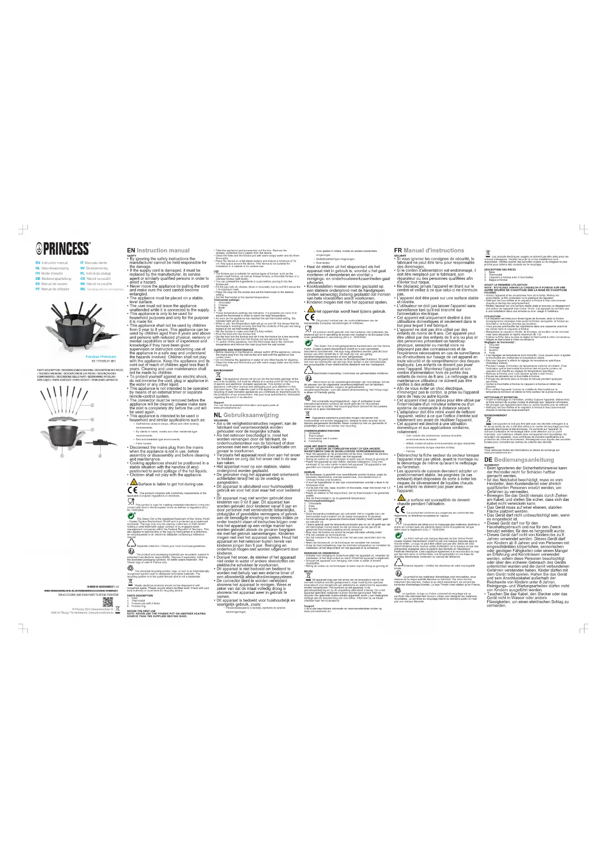 - Nettoyez les fourchettes et le caquelon à fondue à l'eau savonneuse chaude et séchez-les soigneusement. ENVIRONNEMENT Cet appareil ne doit pas être jeté avec les déchets ménagers à la fin de sa durée de vie, il doit être remis à un centre de recyclage pour les appareils électriques et électroniques. Ce symbole sur l'appareil, le manuel d'utilisation et l'emballage attire votre attention sur un point important. Les matériaux utilisés dans cet appareil sont recyclables. En recyclant vos appareils, vous contribuez de manière significative à la protection de notre environnement. Renseignez-vous auprès des autorités locales pour connaître les centres de collecte des déchets. Support Vous retrouvez toutes les informations et pièces de rechange sur www.princesshome.eu! DEBedienungsanleitung SICHERHEIT