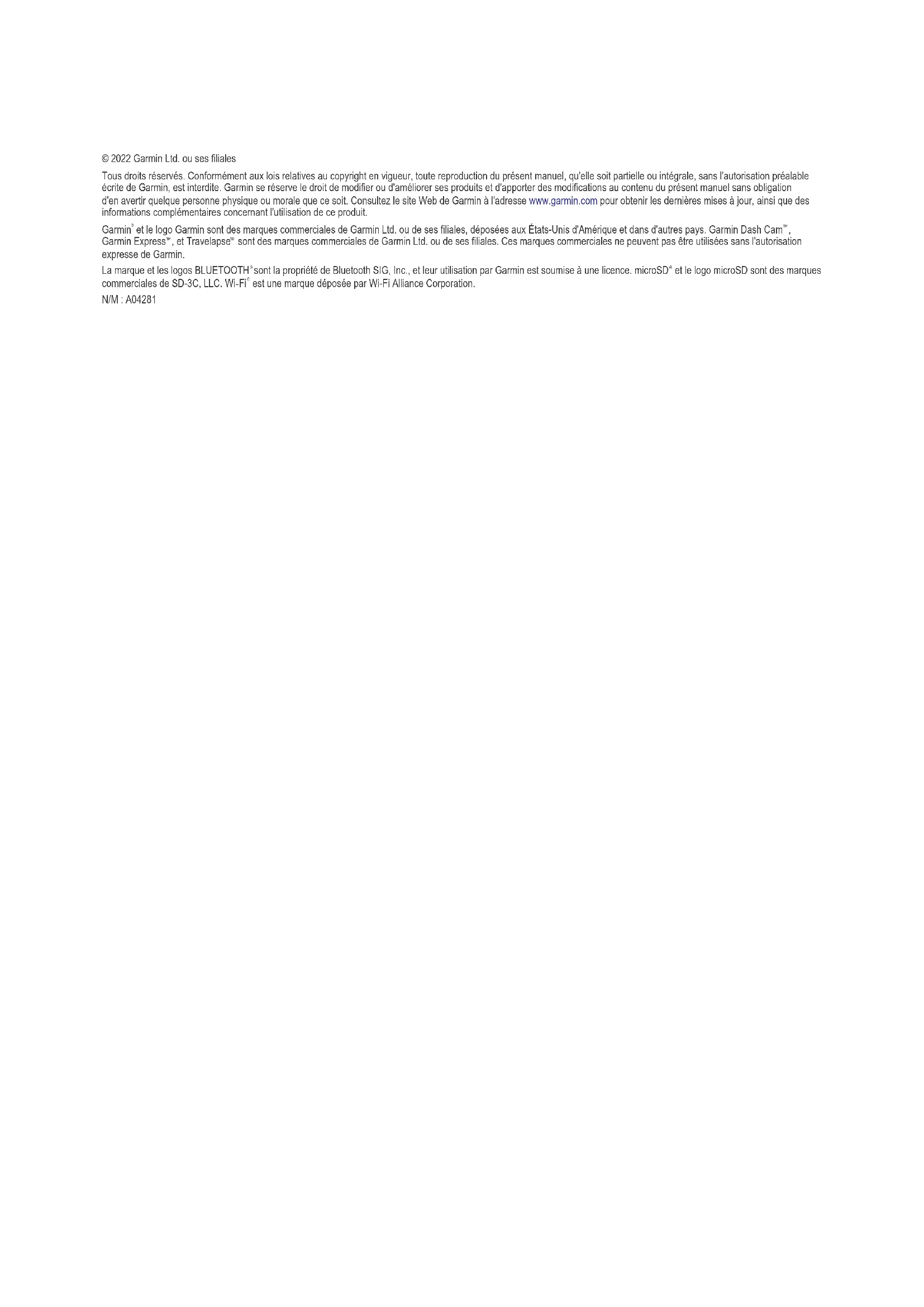 et le logo Garmin sont des marques commerciales de Garmin Ltd. ou de ses filiales, déposées aux États-Unis d'Amérique et dans d'autres pays. Garmin Dash Cam