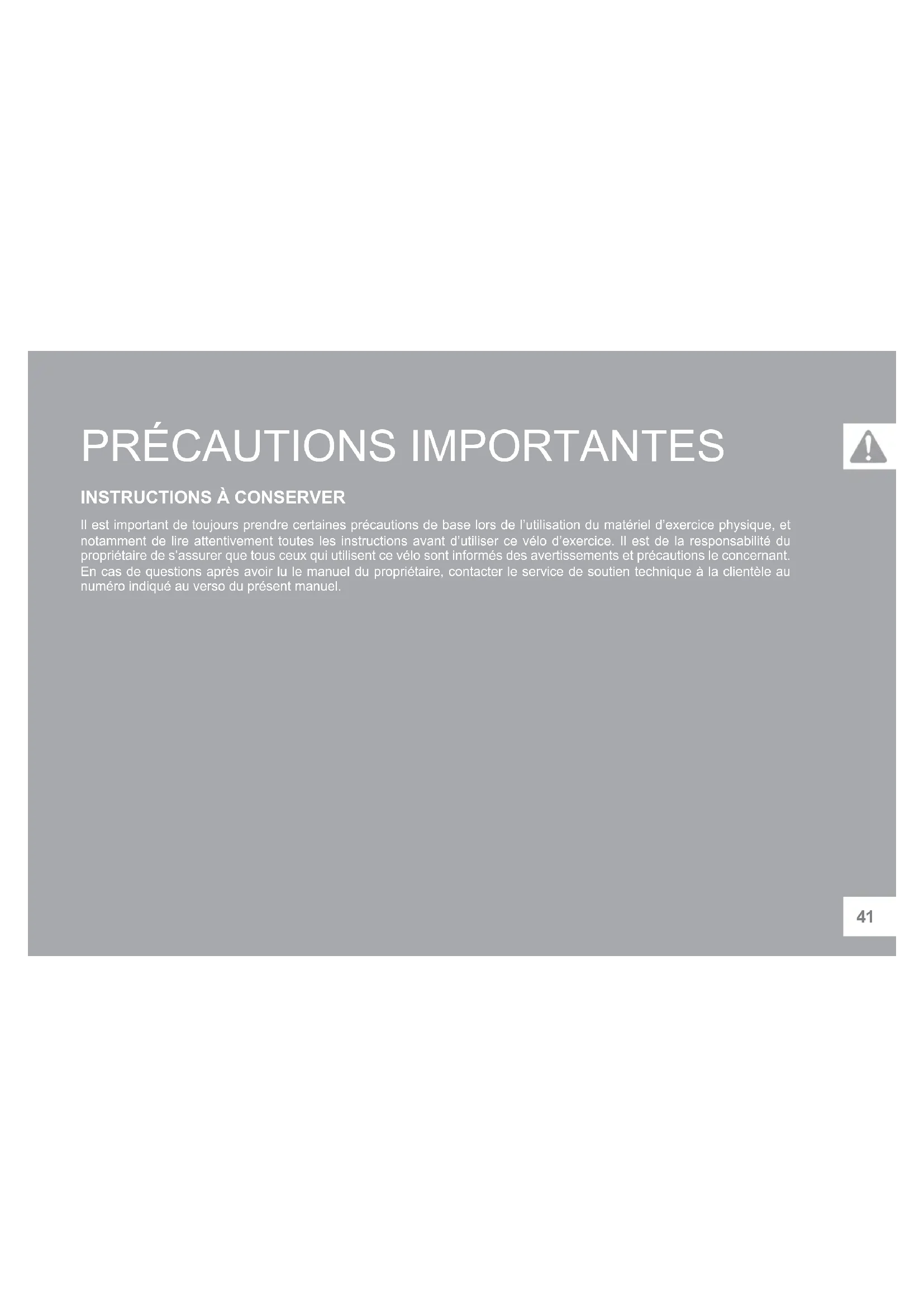 INSTRUCTIONS À CONSERVER Il est important de toujours prendre certaines précautions de base lors de l’utilisation du matériel d’exercice physique, et notamment de lire attentivement toutes les instructions avant d’utiliser ce vélo d’exercice. Il est de la responsabilité du propriétaire de s’assurer que tous ceux qui utilisent ce vélo sont informés des avertissements et précautions le concernant. En cas de questions après avoir lu le manuel du propriétaire, contacter le service de soutien technique à la clientèle au numéro indiqué au verso du présent manuel.42 LIRE ATTENTIVEMENT ET CONSERVER TOUTES LES INSTRUCTIONS AVANT D’ASSEMBLER OU D’UTILISER CE VÉLO D’EXERCICE. IL EST VIVEMENT RECOMMANDÉ DE SUIVRE LES INSTRUCTIONS DE SÉCURITÉ SUIVANTES.