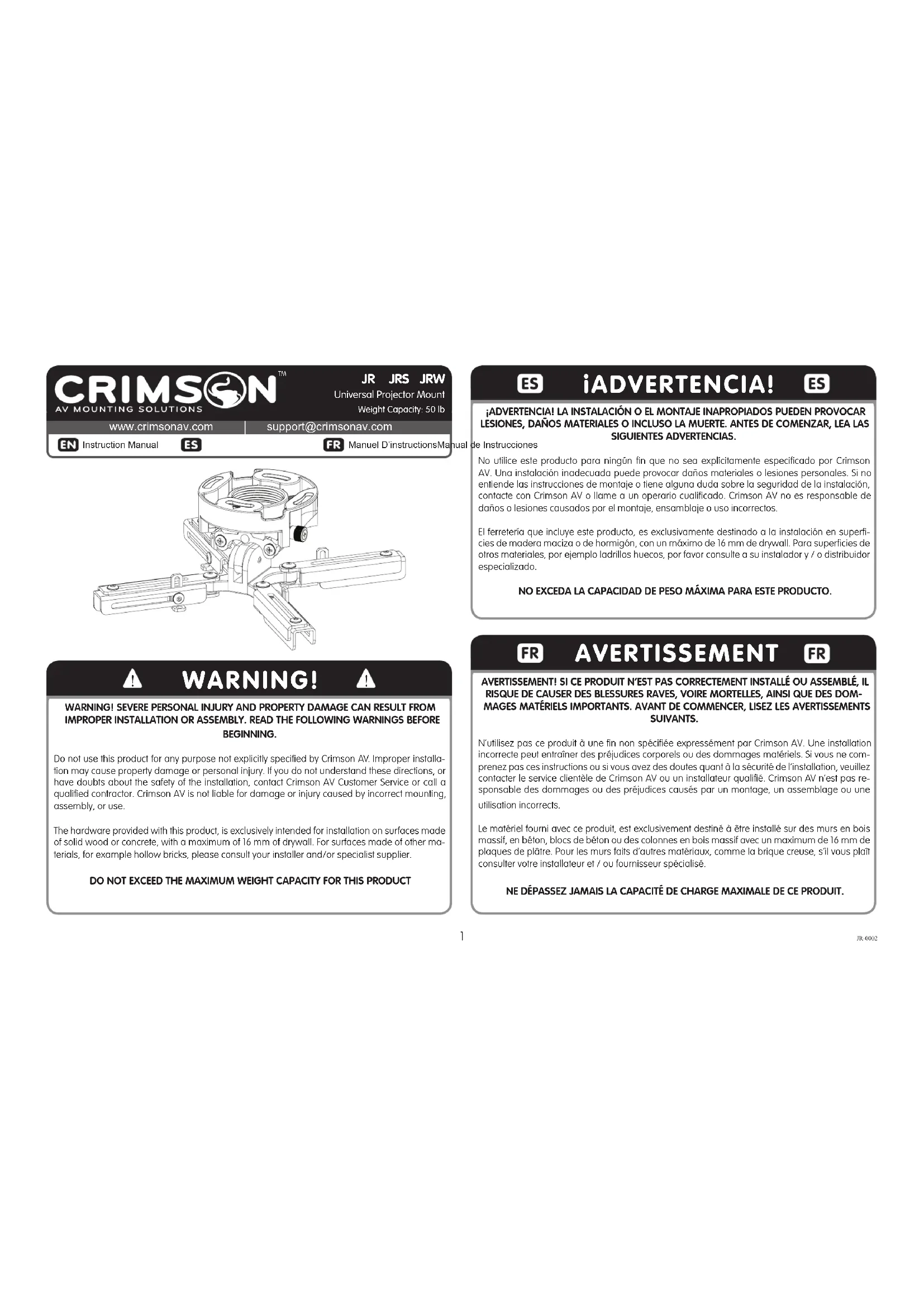 WARNING! SEVERE PERSONAL INJURY AND PROPERTY DAMAGE CAN RESULT FROM IMPROPER INSTALLATION OR ASSEMBLY. READ THE FOLLOWING WARNINGS BEFORE BEGINNING. Do not use this product for any purpose not explicitly specified by Crimson AV. Improper installa- tion may cause property damage or personal injury. If you do not understand these directions, or have doubts about the safety of the installation, contact Crimson AV Customer Service or call a qualified contractor. Crimson AV is not liable for damage or injury caused by incorrect mounting, assembly, or use.The hardware provided with this product, is exclusively intended for installation on surfaces made of solid wood or concrete, with a maximum of 16 mm of drywall. For surfaces made of other ma-terials, for example hollow bricks, please consult your installer and/or specialist supplier.DO NOT EXCEED THE MAXIMUM WEIGHT CAPACITY FOR THIS PRODUCT WARNING! AVERTISSEMENT! SI CE PRODUIT N’EST PAS CORRECTEMENT INSTALLÉ OU ASSEMBLÉ, IL RISQUE DE CAUSER DES BLESSURES RAVES, VOIRE MORTELLES, AINSI QUE DES DOM-MAGES MATÉRIELS IMPORTANTS. AVANT DE COMMENCER, LISEZ LES AVERTISSEMENTS SUIVANTS.N’utilisez pas ce produit à une fin non spécifiée expressément par Crimson AV. Une installation incorrecte peut entraîner des préjudices corporels ou des dommages matériels. Si vous ne com-prenez pas ces instructions ou si vous avez des doutes quant à la sécurité de l’installation, veuillez contacter le service clientèle de Crimson AV ou un installateur qualifié. Crimson AV n’est pas re- sponsable des dommages ou des préjudices causés par un montage, un assemblage ou une utilisation incorrects.Le matériel fourni avec ce produit, est exclusivement destiné à être installé sur des murs en bois massif, en béton, blocs de béton ou des colonnes en bois massif avec un maximum de 16 mm de plaques de plâtre. Pour les murs faits d’autres matériaux, comme la brique creuse, s’il vous plaît consulter votre installateur et / ou fournisseur spécialisé.NE DÉPASSEZ JAMAIS LA CAPACITÉ DE CHARGE MAXIMALE DE CE PRODUIT. AVERTISSEMENT2 JR-0002 PACKAGE CONTENTS Contenido del paquete Contenu de l’emballage