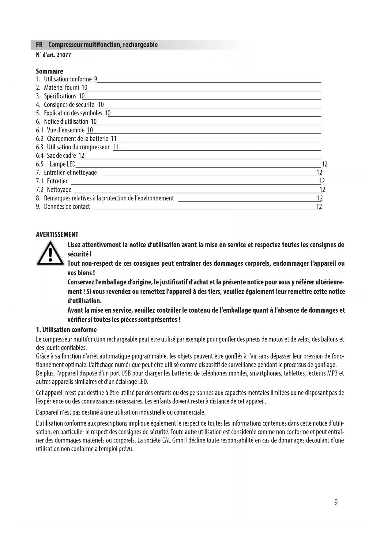 Le compresseur multifonction rechargeable peut être utilisé par exemple pour goner des pneus de motos et de vélos, des ballons et des jouets gonables. Grâce à sa fonction d‘arrêt automatique programmable, les objets peuvent être gonés à l‘air sans dépasser leur pression de fonc- tionnement optimale. L‘achage numérique peut être utilisé comme dispositif de surveillance pendant le processus de gonage. De plus, l‘appareil dispose d‘un port USB pour charger les batteries de téléphones mobiles, smartphones, tablettes, lecteurs MP3 et autres appareils similaires et d‘un éclairage LED. Cet appareil n‘est pas destiné à être utilisé par des enfants ou des personnes aux capacités mentales limitées ou ne disposant pas de l‘expérience ou des connaissances nécessaires. Les enfants doivent rester à distance de cet appareil. L‘appareil n‘est pas destiné à une utilisation industrielle ou commerciale. L‘utilisation conforme aux prescriptions implique également le respect de toutes les informations contenues dans cette notice d‘utili- sation, en particulier le respect des consignes de sécurité. Toute autre utilisation est considérée comme non conforme et peut entraî- ner des dommages matériels ou corporels. La société EAL GmbH décline toute responsabilité en cas de dommages découlant d’une utilisation non conforme à l’emploi prévu. FR Compresseur multifonction, rechargeable N° d‘art. 2107710