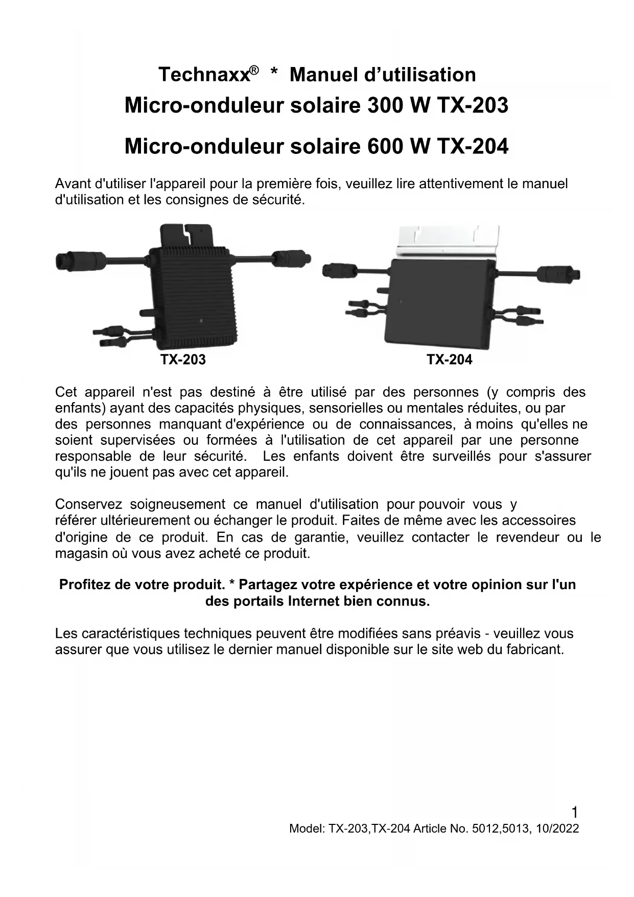 - Manuel d’utilisation Micro-onduleur solaire 300 W TX-203 Micro-onduleur solaire 600 W TX-204 Avant d'utiliser l'appareil pour la première fois, veuillez lire attentivement le manuel d'utilisation et les consignes de sécurité.