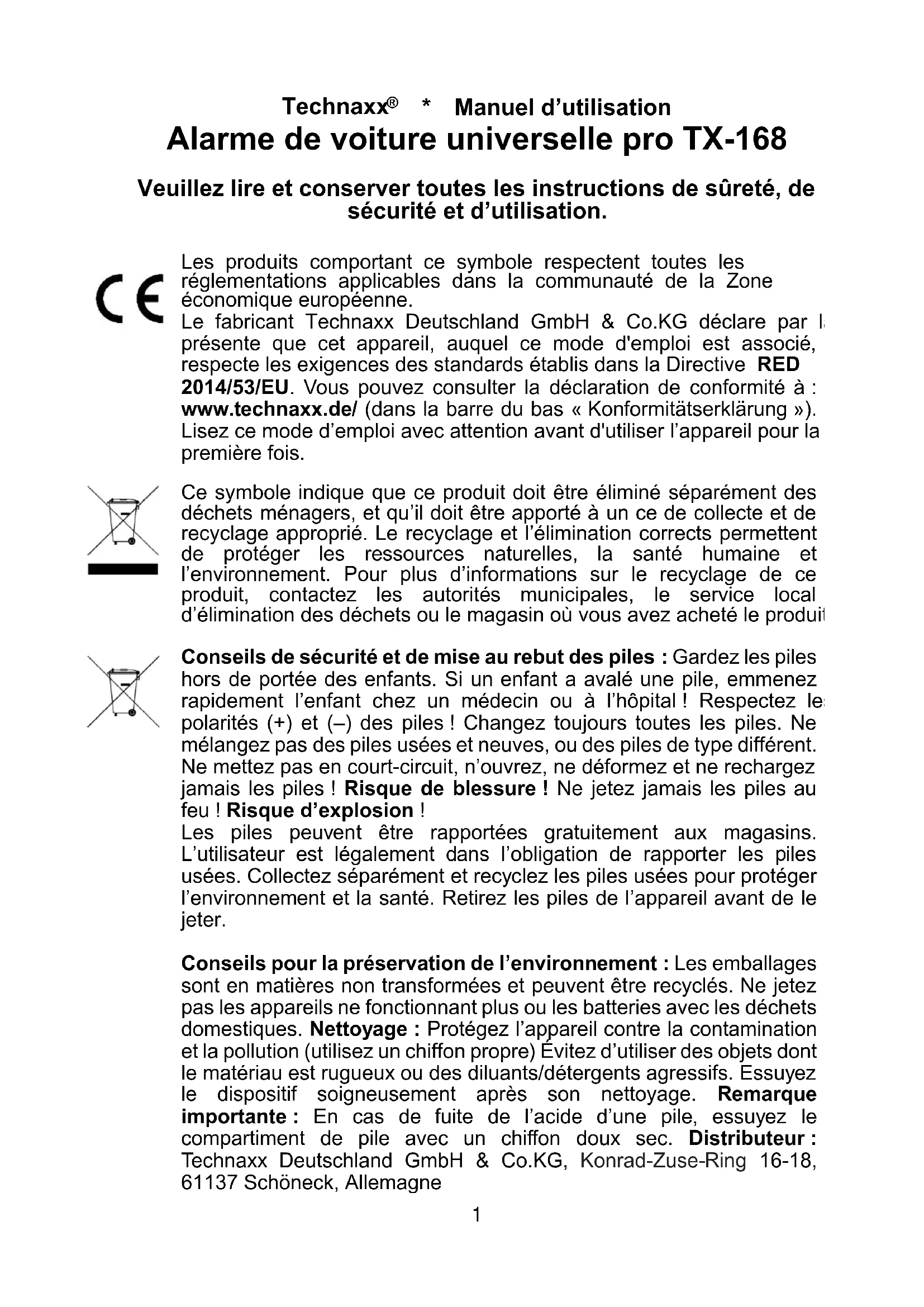 Le volume de l'alarme sera d'environ 105dB et peut dégrader votre audition ou celle de vos agresseurs.16 Courant de fonctionnement (alarme de voiture) 600mA Tension d’entrée (Sirène) CC12 ou 24V (connexion directe avec la batterie de la voiture) Courant de fonctionnement (sirène) 100mA Pile de télécommande CR2032 Fusible de la sirène 3A (remplaçable) ; dimensions standard Longueur du câble de sirène 1,5m Fréquence de transmission 2,4 GHz Type de fréquence ASK Puissance de sortie rayonnée Maximum 15,85mW (sur pression unique du bouton de la télécommande, pas maintenu enfoncé) Matériau de fabrication ABS Température de fonctionnement -10°C – +50°C Poids / Dimensions (alarme de voiture) 69g / (L) 3,0 x (l) 3,0x (H) 13,5cm Poids / Dimensions (sirène avec câble de connexion et fusible) 120g / (L) 7,3 x (l) 5,7 x (H) 6,2cm Poids / Dimensions (télécommande) 16g / (L) 5,9 x (l) 3,7 x (H) 1,0cm Contenu de la boîte Alarme de voiture universelle pro TX-168: Alarme de voiture, sirène externe avec câble de connexion et fusible 3A, télécommande (avec pile CR2032), matériel de monture, Manuel d’utilisation17 Élimination Équipement électrique domestique en fin de vie utile ⚫Lorsque vous n’avez plus besoin de l’appareil, jetez-le dans un conteneur de collecte publique pour la récupération des appareils électriques et électroniques ne fonctionnant plus. ⚫Ne jamais jeter les équipements électriques avec les déchets ménagers. Remarques supplémentaires sur l’élimination ⚫Traitez les appareils électriques et électroniques ne fonctionnant plus de manière que leur réutilisation ou recyclage puisse être effectué du mieux possible. Retirez les batteries avant de les éliminer et n’endommagez pas les conteneurs de liquides. ⚫Les appareils électriques ne fonctionnant plus peuvent contenir des substances dangereuses. Si l’appareil est manipulé de manière incorrecte ou endommagé, cela peut impacter négativement la santé humaine ou contaminer l’eau ou la terre pendant le recyclage. Garantie Conservez soigneusement ce mode d’emploi pour référence future ou pour le transférer au propriétaire suivant. Faites de même avec les accessoires d’origine pour ce produit. Pour faire une demande de garantie, veuillez contacter le revendeur ou le magasin où vous avez acheté le produit. Garantie de 2 ans Support Numéro de service pour l’assistance technique : 01805 012643 (14 cents/minute depuis une ligne fixe allemande et 42 cents/minute depuis des réseaux mobiles). E-mail gratuit : support@technaxx.de La ligne d'assistance téléphonique est disponible du lundi au vendredi, de 9 heures à 13 heures et 14 heures à 17 heures.