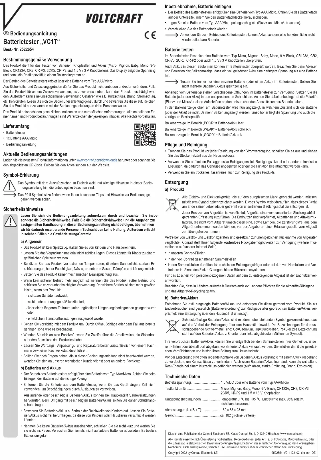 - Ne démontez pas les piles/batteries. Ne les court-circuitez pas. Ne les jetez pas au feu. Ne jamais tenter de charger des piles non rechargeables. Risque d‘explosion ! Ce document est une publication de Conrad Electronic SE, Klaus-Conrad-Strasse 1, D-92240 Hirschau - Allemagne (www.conrad.com). Tous droits réservés y compris la traduction. La reproduction par n‘importe quel moyen, p. ex. photo- copie, microlm ou saisie dans des systèmes de traitement électronique des données, nécessite l‘autorisation préalable par écrit de l‘éditeur. La réimpression, même en partie, est interdite. Cette publication représente l‘état technique au moment de l‘impression.Copyright 2022 by Conrad Electronic SE. *2522654_V2_1122_02_dm_mh_FRIn bedrijf nemen, batterij plaatsen