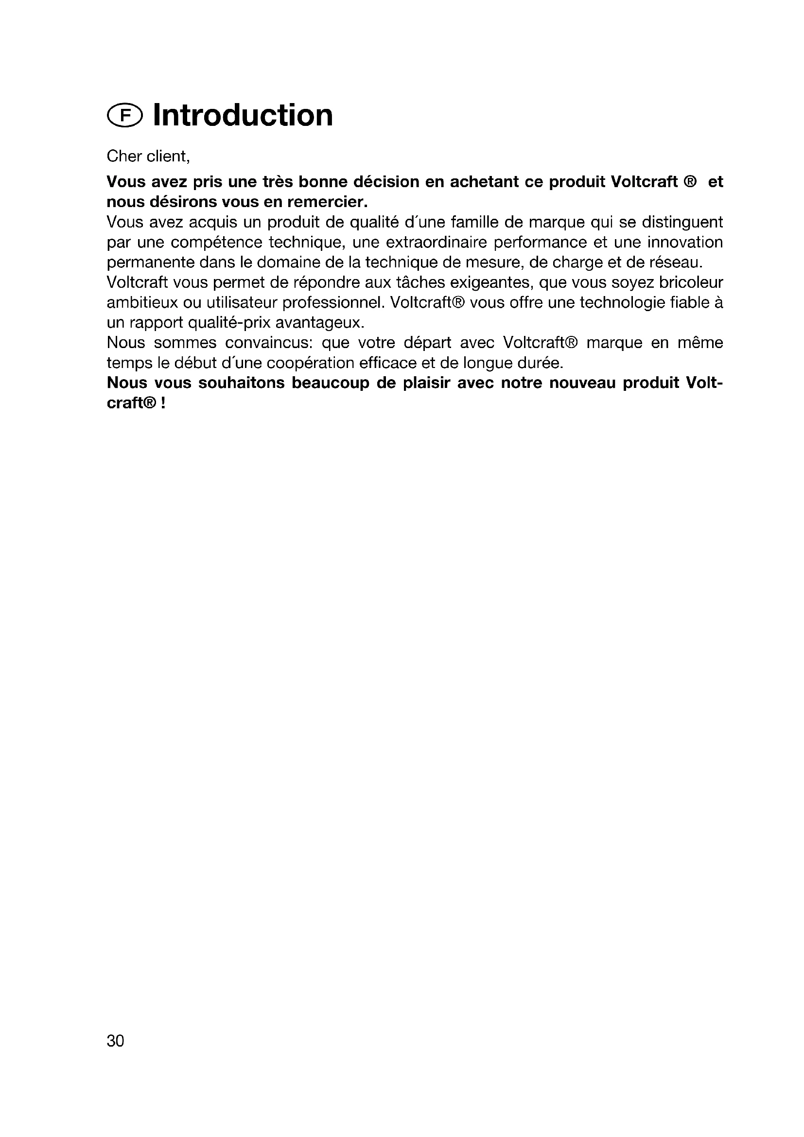 - Introduction Cher client, Vous avez pris une très bonne décision en achetant ce produit Voltcraft ® et nous désirons vous en remercier. Vous avez acquis un produit de qualité d´une famille de marque qui se distinguent par une compétence technique, une extraordinaire performance et une innovation permanente dans le domaine de la technique de mesure, de charge et de réseau. Voltcraft vous permet de répondre aux tâches exigeantes, que vous soyez bricoleur ambitieux ou utilisateur professionnel. Voltcraft® vous offre une technologie fiable à un rapport qualité-prix avantageux. Nous sommes convaincus: que votre départ avec Voltcraft® marque en même temps le début d´une coopération efficace et de longue durée. Nous vous souhaitons beaucoup de plaisir avec notre nouveau produit Volt- craft® !31 Table des matières Introduction p. 30