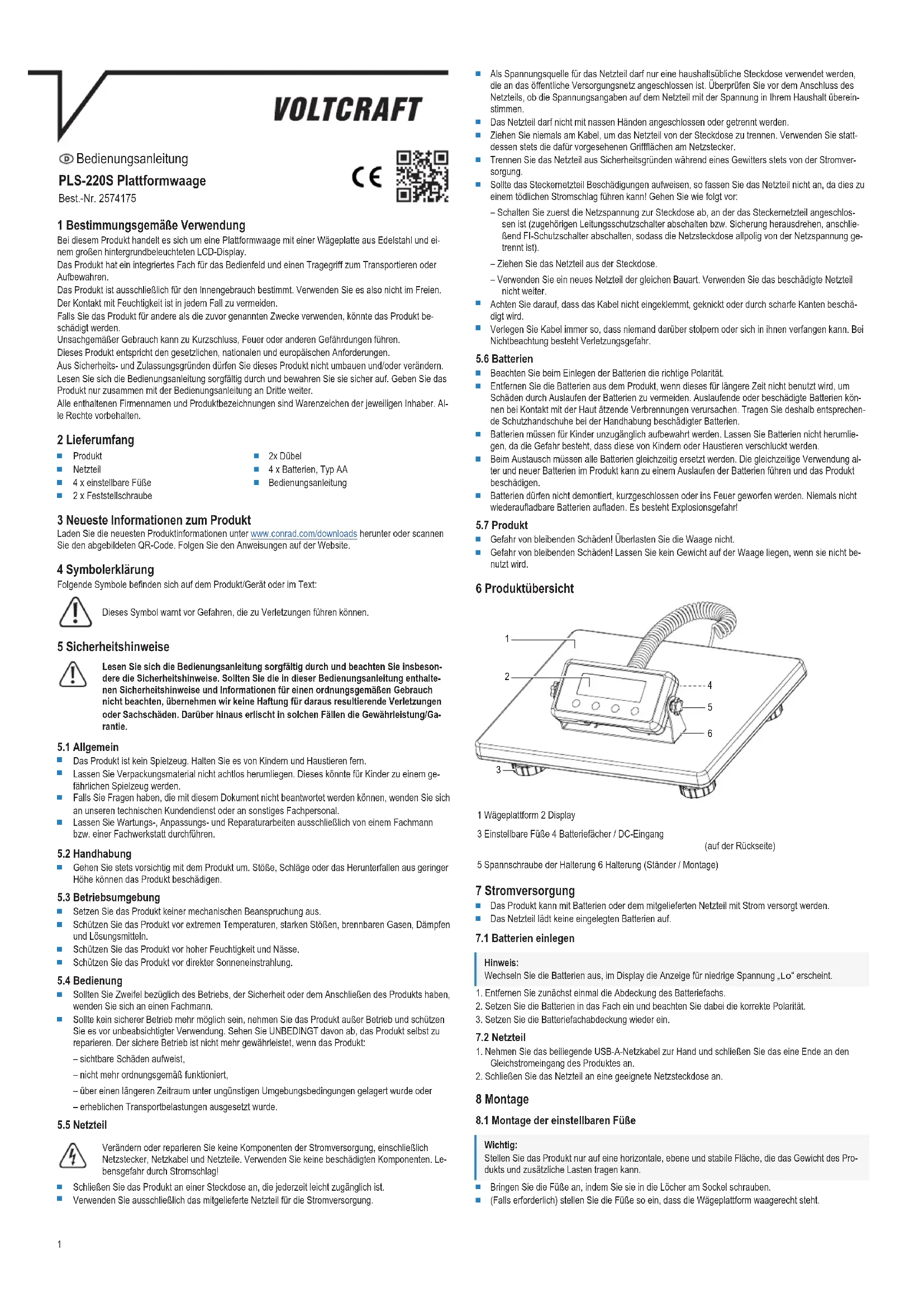 Input ....................................................... 100 - 240 V/AC, 50/60 Hz 0.3 A max. Output..................................................... 6.0 V/DC 1.0 A, 6.0 W This is a publication by Conrad Electronic SE, Klaus-Conrad-Str. 1, D-92240 Hirschau (www.conrad.com). All rights including translation reserved. Reproduction by any method (e.g. photocopying, microfilming or the capture in electronic data processing systems) requires prior written approval from the editor. Reprinting, also in part, is prohibited. This publication reflects the technical status at the time of printing. Copyright by Conrad Electronic SE. *2574175_V2_0822_dh_mh_en 9007199873875979-2 I2/O2 en5 Mode d’emploi Balance à plateformePLS-220S N° de commande 2574175 1 Utilisation conforme Ce produit est une balance à plateforme avec un plateau de pesée en acier inoxydable et un grand écranLCD rétro-éclairé. Le produit dispose d'un arrimage intégré pour le panneau de commande et d'une poignée pour le trans- port ou le stockage. Le produit est destiné uniquement à une utilisation à l’intérieur. Ne l'utilisez pas à l’extérieur. Dans tous les cas, le contact avec l’humidité doit être évité. Toute utilisation à des fins autres que celles décrites pourrait endommager le produit. Une mauvaise utilisation peut entraîner des risques tels que des courts-circuits, des incendies, etc. Ce produit est conforme aux exigences nationales et européennes en vigueur. Pour des raisons de sécurité et d’homologation, toute restructuration et/ou modification du produit est in- terdite. Lisez attentivement les instructions du mode d’emploi et conservez-le dans un endroit sûr. Ne mettez ce produit à la disposition de tiers qu’avec son mode d’emploi. Tous les noms d’entreprises et appellations de produits sont des marques commerciales de leurs proprié- taires respectifs. Tous droits réservés. 2 Contenu de l'emballage