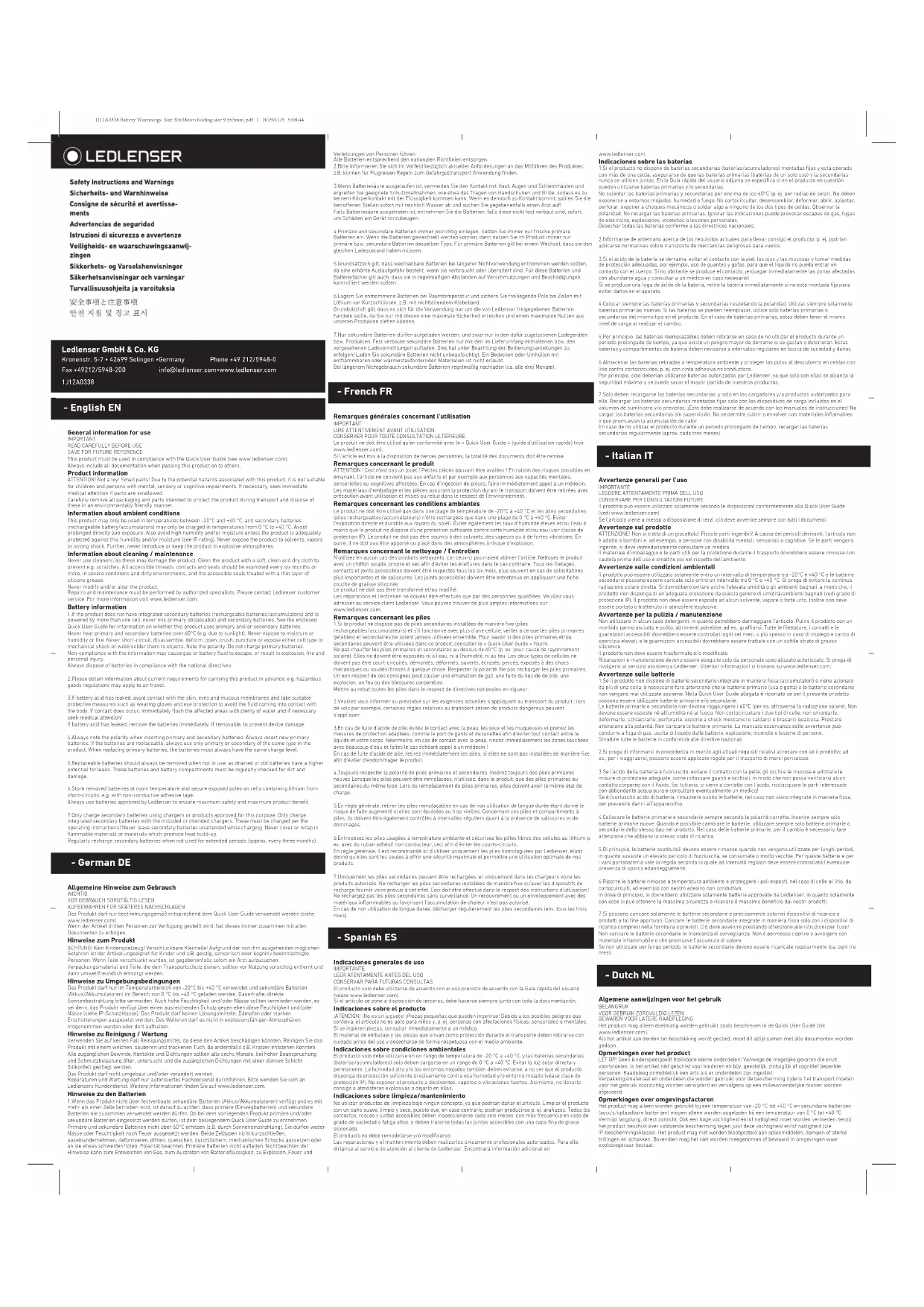 Le produit ne doit être utilisé qu'en conformité avec le « Quick User Guide » (guide d'utilisation rapide) (voir www.ledlenser.com). Si l'article est mis à la disposition de tierces personnes, la totalité des documents doit être remise. Remarques concernant le produit ATTENTION ! Ceci n'est pas un jouet ! Petites pièces pouvant être avalées ! En raison des risques possibles en émanant, l'article ne convient pas aux enfants et par exemple aux personnes aux capacités mentales, sensorielles ou cognitives aectées. En cas d'ingestion de pièces, faire immédiatement appel à un médecin. Les matériaux d'emballage et les pièces assurant la protection durant le transport doivent être retirées avec précaution avant utilisation et mises au rebut dans le respect de l'environnement. Remarques concernant les conditions ambiantes Le produit ne doit être utilisé que dans une plage de température de -20°C à +40 °C et les piles secondaires (piles rechargeables/accumulateurs) n'être rechargées que dans une plage de 0 °C à +40 °C. Éviter l'exposition directe et durable aux rayons du soleil. Éviter également les taux d'humidité élevés et/ou l'eau à moins que le produit ne dispose d'une protection susante contre cette humidité et/ou eau (voir classe de protection IP). Le produit ne doit pas être soumis à des solvants, des vapeurs ou à de fortes vibrations. En outre, il ne doit pas être apporté ou placé dans des atmosphères à risque d'explosion. Remarques concernant le nettoyage / l'entretien N'utilisez en aucun cas des produits nettoyants, car ceux-ci pourraient abîmer l'article. Nettoyez le produit avec un chion souple, propre et sec afin d'éviter les éraflures dans le cas contraire. Tous les filetages, contacts et joints accessibles doivent être inspectés tous les six mois, plus souvent en cas de sollicitations plus importantes et de salissures. Les joints accessibles doivent être entretenus en appliquant une fiche couche de graisse siliconée. Le produit ne doit pas être transformé et/ou modifié. Les réparations et l'entretien ne doivent être eectués que par des personnes qualifiées. Veuillez vous adresser au service client Ledlenser. Vous pouvez trouver de plus amples informations sur www.ledlenser.com. Remarques concernant les piles 1.Si le produit ne dispose pas de piles secondaires installées de manière fixe (piles rechargeables/accumulateurs) et s'il fonctionne avec plus d'une cellule, veiller à ce que les piles primaires (jetables) et secondaires ne soient jamais utilisées ensemble. Pour savoir si des piles primaires et/ou secondaires peuvent être utilisées dans ce produit, consulter le « Quick User Guide » fourni. Ne pas chauer les piles primaires et secondaires au dessus de 60°C (p. ex. pour cause de rayonnement solaire). Elles ne doivent être exposées ni à l'eau, ni à l'humidité, ni au feu. Les deux types de cellules ne doivent pas être court-circuités, démontés, déformés, ouverts, écrasés, percés, exposés à des chocs mécaniques ou soudés/brasés à quelque chose. Respecter la polarité. Ne pas recharger les piles primaires. Un non respect de ces consignes peut causer une émanation de gaz, une fuite du liquide de pile, une explosion, un feu ou des blessures corporelles. Mettre au rebut toutes les piles dans le respect de directives nationales en vigueur. 2.Veuillez vous informer au préalable sur les exigences actuelles s'appliquant au transport du produit ; lors de vols par exemple, certaines règles relatives au transport aérien de produits dangereux peuvent s'appliquer. 3.En cas de fuite d'acide de pile, évitez le contact avec la peau, les yeux et les muqueuses et prenez les mesures de protection adaptées, comme le port de gants et de lunettes afin d'éviter tout contact entre le liquide et votre corps. Néanmoins, en cas de contact avec la peau, rincez immédiatement les zones touchées avec beaucoup d'eau et faites le cas échéant appel à un médecin ! En cas de fuite d'acide de pile, retirez immédiatement les piles, si elles ne sont pas installées de manière fixe, afin d'éviter d'endommager le produit. 4.Toujours respecter la polarité de piles primaires et secondaires. Insérez toujours des piles primaires neuves Lorsque les piles peuvent être remplacées, n'utilisez, dans le produit, que des piles primaires ou secondaires du même type. Lors du remplacement de piles primaires, elles doivent avoir le même état de charge. 5.En règle générale, retirer les piles remplaçables en cas de non utilisation de longue durée étant donné le risque de fuite augmenté si elles sont épuisées ou trop vieilles. Concernant ces piles et compartiments à piles, ils doivent être également contrôlés à intervalles réguliers quant à la présence de salissures et de dommages. 6.Entreposez les piles usagées à température ambiante et sécurisez les pôles libres des cellules au lithium p. ex. avec du ruban adhésif non conducteur, ceci afin d'éviter les courts-circuits. En règle générale, il est recommandé ici d'utiliser uniquement les piles homologuées par Ledlenser, étant donné qu'elles sont les seules à orir une sécurité maximale et permettre une utilisation optimale de nos produits. 7.Uniquement les piles secondaires peuvent être rechargées, et uniquement dans les chargeurs voire les produits autorisés. Ne recharger les piles secondaires installées de manière fixe qu'avec les dispositifs de recharge fournis voire prévus à cet eet. Ceci doit être eectué dans le respect des instructions d'utilisation ! Ne rechargez pas les piles secondaires sans surveillance. Un recouvrement ou un enveloppement avec des matériaux inflammables ou favorisant l'accumulation de chaleur n'est pas autorisé. En cas de non utilisation de longue durée, décharger régulièrement les piles secondaires (env. tous les trois mois). Indicaciones generales de uso IMPORTANTE