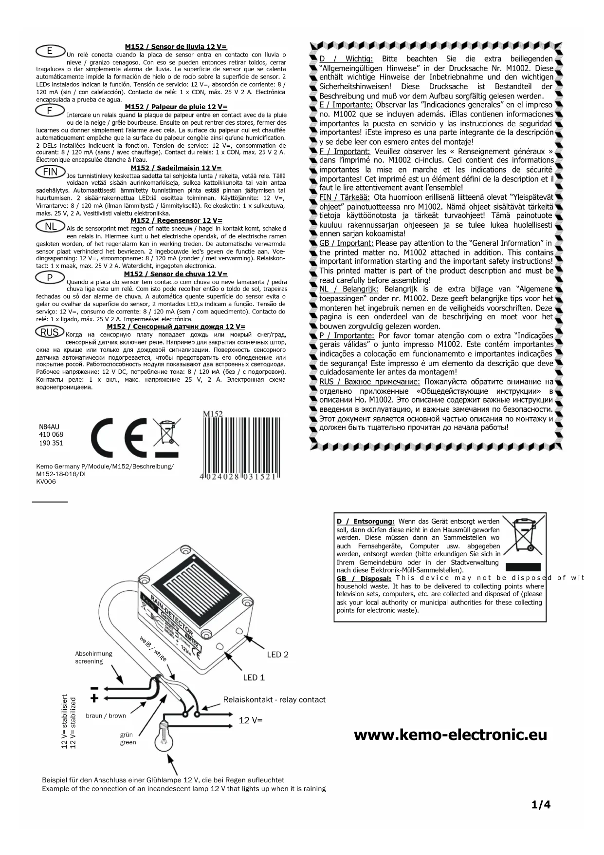 M152 - Capteur électronique Kemo - Notice d'utilisation et mode d'emploi gratuit
