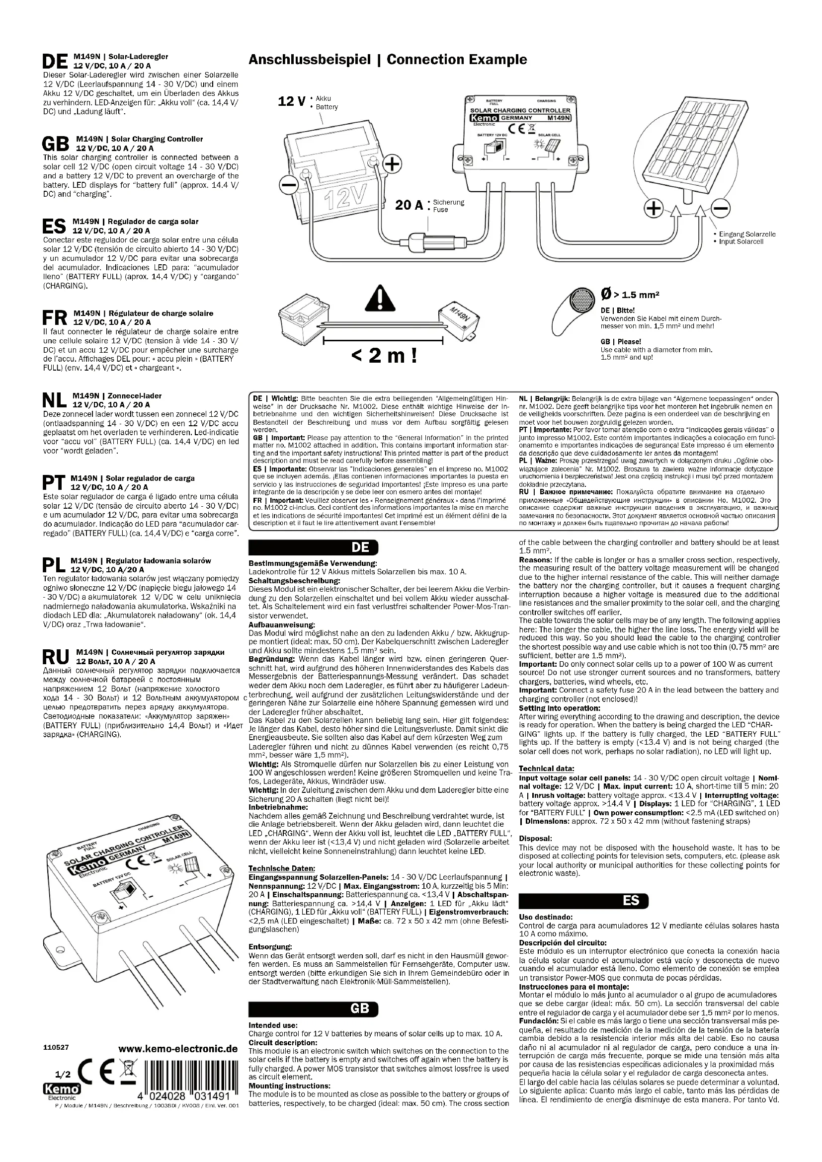 Usage prévu: Contrôle de charge pour accus 12 V accus au moyen des cellules solaires jusqu’à 10 A au maximum. Description du montage: Ce module est un commutateur électronique qui intercale la conne- xion vers les cellules solaires quand l’accu est vide et débranche de nouveau quand l’accu est plein. Un transistor Power-MOS qui com- mute presque sans pertes est utilisé comme élément de circuit. Instructions d’assemblage: Montez le module le plus près de l’accu ou du groupe d’accus qui doivent être chargés (idéal: 50 cm au maximum). La section du câb- le entre le régulateur de charge et l’accu doit être au moins 1,5 mm². Raison: Si le câble est plus long ou a une section plus petite, le résultat de la mesure de la tension de batterie changera en raison de la résistance interne plus élevée du câble. Ceci ne nuit ni au accu ni au régulateur de charge, mais ceci mène à une interruption de charge fréquente, parce qu’une tension plus haute est mesurée en raison des résistivités additionnelles et la proximité plus petite vers la cellule solaire et le régulateur de charge déconnecte plus tôt. On peut choisir la longueur du câble vers les cellules solaires à vo- lonté. Le suivant est valable: Le plus long le câble, le plus haut sont les pertes dans la ligne. De cette façon le rendement d’énergie bais- se. Pour cette raison vous devriez guider le câble vers le régulateur de charge sur le chemin le plus court et n’utilisez pas du câble qui est trop mince (0,75 mm² sont sufsants, mais 1,5 mm² seraient mieux). Important: Raccordez seulement des cellules solaires jusqu’à une puissance de 100 W comme source de courant! Pas de sources de courant plus fortes et pas de transformateurs, chargeurs de batte- ries, accus, éoliennes, etc. Important: Veuillez monter un fusible 20 A dans l’alimentation entre l’accu et le régulateur de charge (pas inclus)! Mise en service: Après avoir câblé tout selon le dessin et la description, le dispositif est en ordre de marche. Quand l’accu est chargé, la DEL « chargeant » (CHARGING) est allumée. Quand l’accu est plein, la DEL « plein » (BATTERY FULL) est allumée. Quand l’accu est vide (<13,4 V) et n’est pas chargé (la cellule solaire ne marche pas, peut-être il n’y a pas d’insolation), aucune DEL est allumée. Données techniques: Tension à l’entrée panneaux des cellules solaires: 14 - 30 V/DC tension à vide | Tension nominale: 12 V/DC | Courant d’entrance max.: 10 A, en peu de temps jusque 5 min: 20 A | Tension lors de la fermeture du circuit: tension de batterie env. <13,4 V | Courant de rupture: tension de batterie env. >14,4 V | Afchages: 1 DEL pour « chargeant accu » (CHARGING), 1 DEL pour « accu plein » (BATTERY FULL) | Consommation d’électricité propre: <2,5 mA (DEL est al- lumée) | Mesures: env. 72 x 50 x 42 mm (sans éclisses de xation) Mise au rebut: L’anti-rongeur ne doit pas être mis au rebut avec les déchets ména- gers mais doit être déposé dans un container destiné à la collecte des appareils électroniques usagers. (S‘il vous plaît renseigner au- près de vos autorités municipales ou les autorités locales pour les points de collecte des déchets électroniques).
