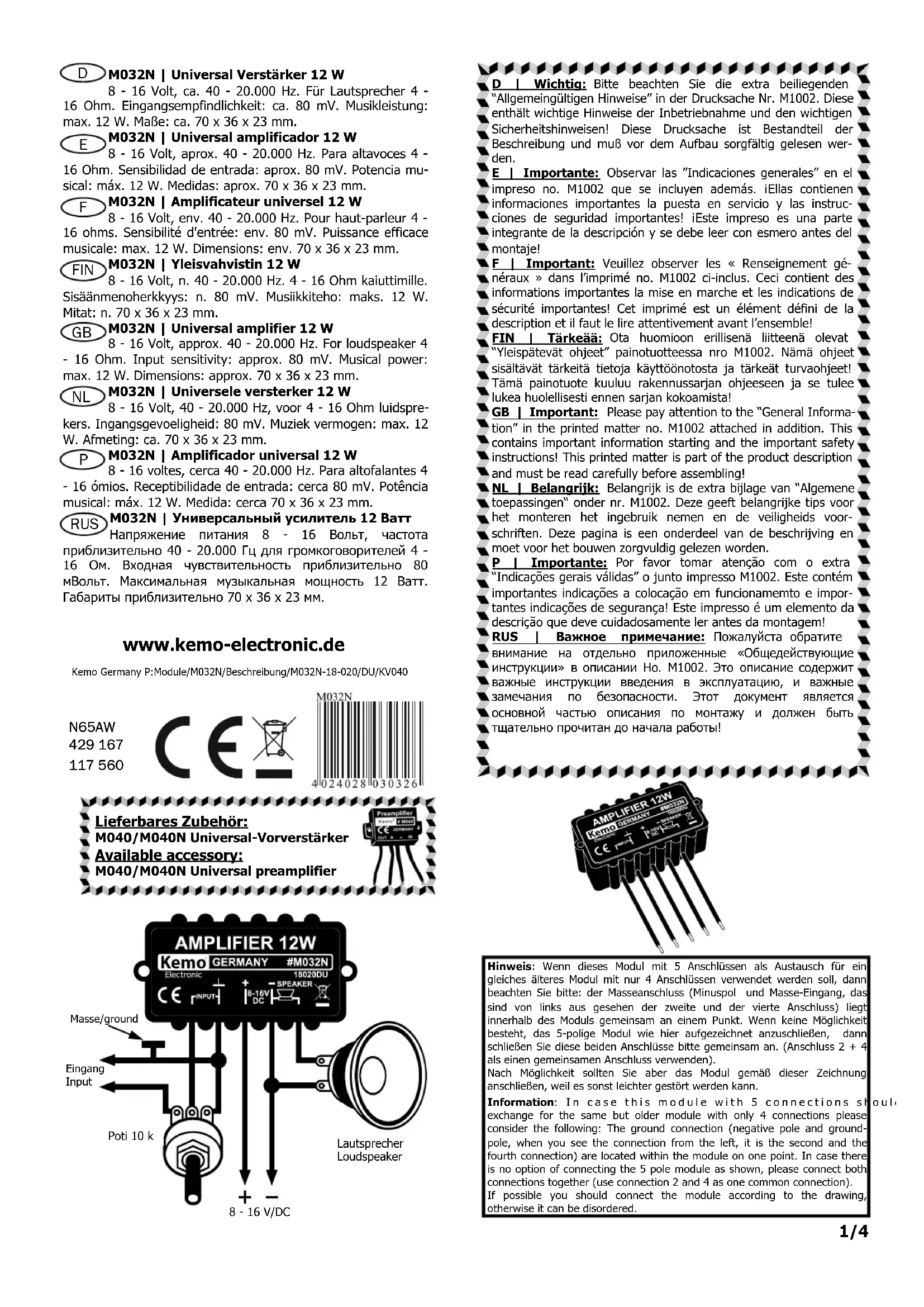 etc.): Causas posibles: La señal de entrada es demasiado alta (el amplificador está sobreexcitado). Solución: preconectar el potenciómetro según el dibujo y girar el regulador hacia abajo. Hay interferencias de señales ajenas en el cable de entrada: Solución: emplear un cable de micrófono apantallado a la entrada y conectar el apantallamiento del cable con "masa /DC polo negativo" y instalar el módulo en una caja metálica y conectar la caja también con "masa". El cable entre el módulo y el regulador de volumen debería tener < 10 cm de largo. Conectar un capacitor electrolítico 1000 µF 25 V directamente al módulo en paralelo a la entrada de la tensión de alimentación (eso ayuda si su suministro de tensión de servicio tiene una resistencia demasiado alta). Datos técnicos: Tensión de servicio: 8 - 16 V/DC | Absorción de corriente: máx. 800 mA | Sensibilidad de entrada: < 80 mV | Conexión de altavoz: 4 - 16 ohmios | Potencia musical: máx. 12 W con 16 V a un altavoz de 4 ohmios | Respuesta de frecuencia: aprox. 40 - 20.000 Hz | Medidas: aprox. 70 x 36 x 23 mm (sin eclisas de fijación) Instructions d’assemblage: Raccordez le module selon le dessin. Le câble vers le réglage de volume (pas inclus) doit avoir une longueur de 10 cm au maximum. La ten- sion de service peut être entre 6 - 16 volts (pile ou bloc d’alimentation sta- bilisé). Faites attention à ce qu’il ait un courant suffisant (max. 800 mA). Donc n’employez pas des piles ou des blocs d’alimentations trop faibles! Vous atteindrez la puissance maximale de 12 W seulement à 16 volts et avec un haut-parleur de 4 ohms. En cas des tensions de service trop petites et / ou des haut-parleurs de valeur ohmique plus élevée, la puissance dimi- nue proportionnellement. Si le signal d’entrée est amené par un câble plus long que 10 cm, vous devez employer un câble protégé. Il faut mettre l’é- cran du câble à terre (pôle négatif du raccord de l’alimentation en courant électrique au module). Si on raccorde des source de signal avec une puis- sance de sortie trop petite (p.ex. microphones dyn.), il faut monter en série un préamplificateur (p.ex. Kemo M040). Attention: Une trop haute tension de service (> 16 V/DC) ou une charge de l’haut-parleur trop petite (< 4 ohms) vont détruire le module! Veuillez vérifier la tension de service pour plus de sûreté, parce qu’il y a des blocs d’alimentation „non-stabilisés“ qui ont une "tension à vide" trop haute! Le module est en effet "résistant aux courts-circuits" passagèrement, mais une impédance de l’haut-parleur trop petite va causer un défaut à long terme. Comme la fonction de chaque module était examinée soigneusement avant l’envoi, un remplacement à bonne volonté n’est pas possible pour les rai- sons mentionnées ci-dessus! Emploi conformément aux dispositions: Amplification des faibles signaux B.F. pour la reproduction par haut-parleur. Liste de contrôle pour le dépistage des erreurs: