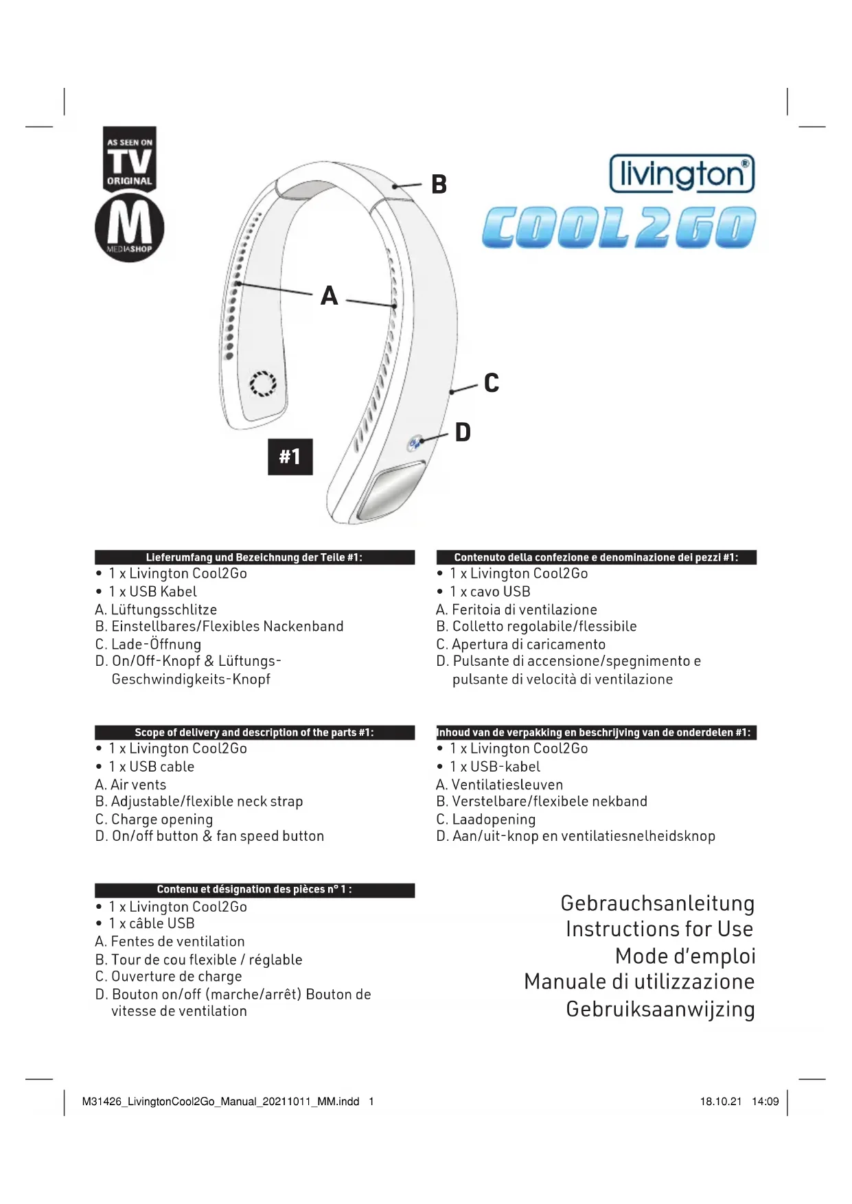 - 1 x USB cable A. Air vents B. Adjustable/flexible neck strap C. Charge opening D. On/off button & fan speed button Contenu et désignation des pièces n° 1 :