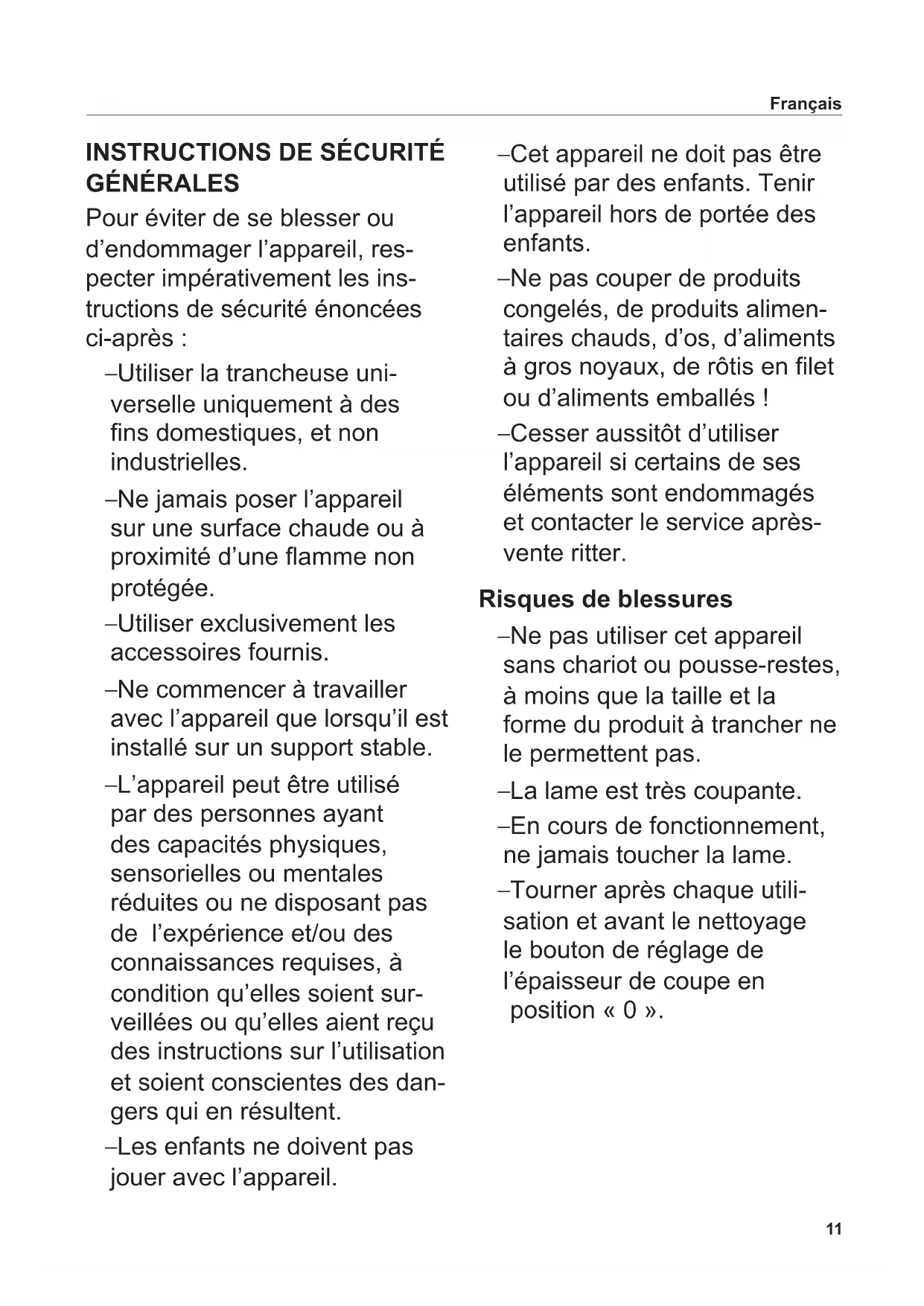 Rabattre le support de gui- dage du produit à découper (11) le cas échéant jusqu’en butée, en position horizontale. Info : Le support de guidage du produit à découper sert à faire passer un produit à découper long et dur à côté de la manivelle sans empêcher le mouvement (par ex. une grosse miche de pain). Il est recommandé de tourner le guidage vers le haut en cas de tranches petites, minces et molles (par ex. en cas de saucisse). Placer le produit sur le chariot (5). Le pousser légè- rement au moyen du pousse- restes (7) contre la plaque protège-lame (3). Se protéger les mains en utilisant toujours le chariot et, le cas échéant, le pousse-restes. Français13 Français