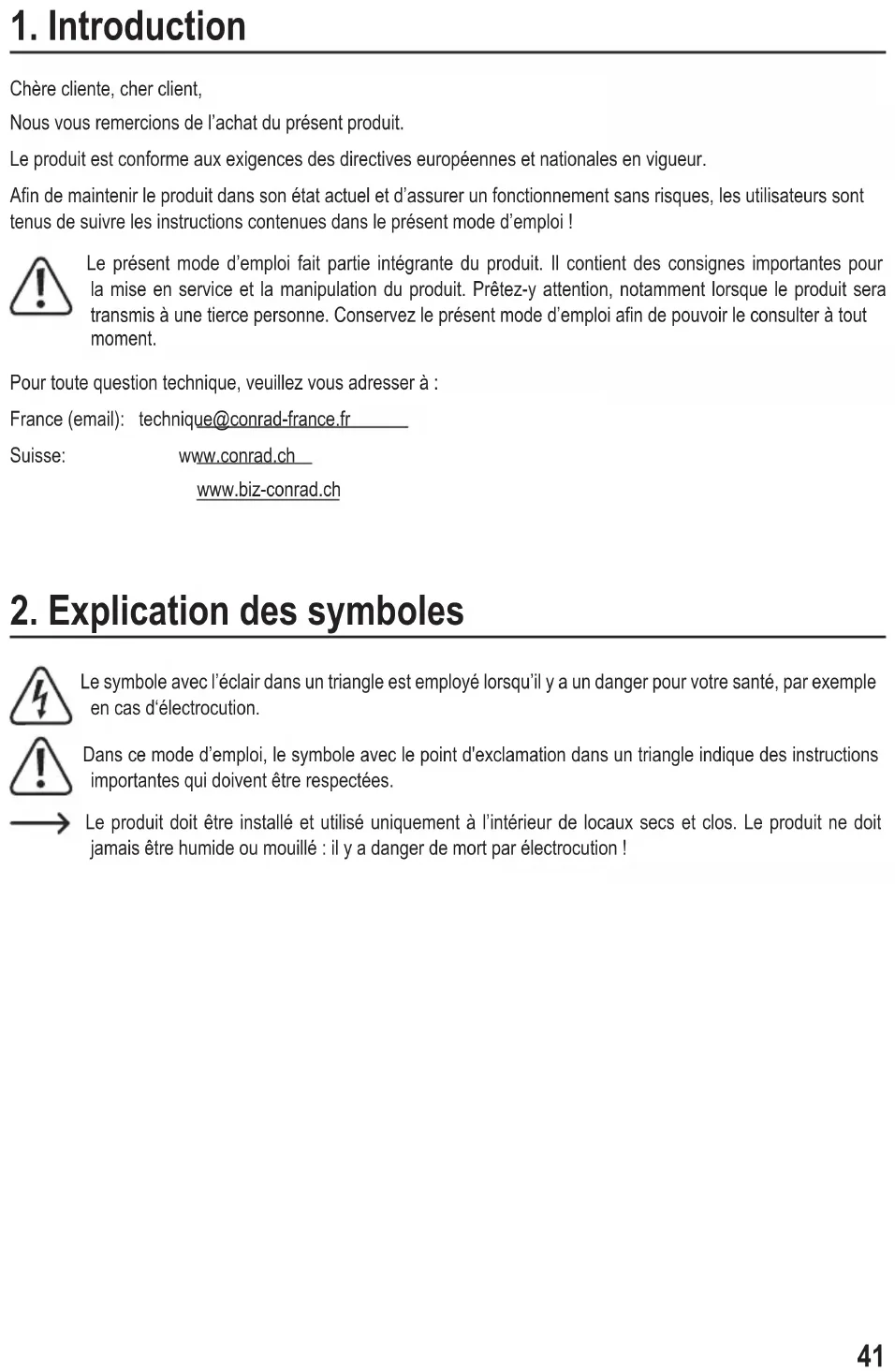 Chère cliente, cher client, Nous vous remercions de l’achat du présent produit. Le produit est conforme aux exigences des directives européennes et nationales en vigueur. Andemaintenirleproduitdanssonétatactueletd’assurerunfonctionnementsansrisques,lesutilisateurssont tenus de suivre les instructions contenues dans le présent mode d’emploi ! Le présent mode d’emploi fait partie intégrante du produit. Il contient des consignes importantes pour la mise en service et la manipulation du produit. Prêtez-y attention, notamment lorsque le produit sera transmisàunetiercepersonne.Conservezleprésentmoded’emploiandepouvoirleconsulteràtout moment. Pour toute question technique, veuillez vous adresser à : France (email): technique@conrad-france.fr Suisse: www.conrad.ch www.biz-conrad.ch