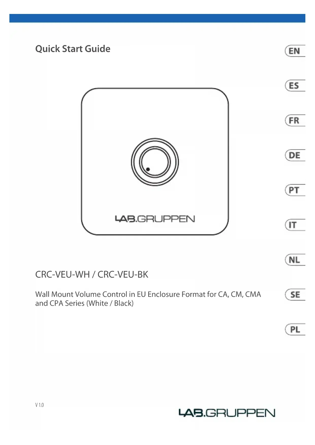 [1.6] 60,40 [2.3780] 22,83 [0.8989] 60,40 [2.3780]14 15Quick Start GuideCRC-VEU-WH / CRC-VEU-BK (FR) Introduction Bienvenue! Merci d’avoir acheté le panneau de contrôle du volume à distance CRC-VEU. En conjonction avec les séries d’amplicateurs commerciaux Lab.Gruppen CA, CM, CMA et CPA, le CRC-VEU permet un contrôle facile du volume. Le CRC-VEU s’adaptera à la plupart des boîtiers d’installation de profondeur standard et se fondra dans n’importe quel décor. Réglages Le CRC-VEU dispose d’un seul bouton de volume avec un anneau lumineux à LED. Configuration de l’éclairage de l’anneau LED L’éclairage annulaire à LED peut être conguré avec un interrupteur sur le PCB. Les positions ON et OFF marquées sur le PCB et l’interrupteur se trouvent entre le PCB et la plaque inférieure. Assemblage et montage Le CRC-VEU se xe dans le boîtier d’installation avec deux vis sous la plaque avant. Retirez le panneau avant et xez l’unité principale dans le boîtier à l’aide des vis de montage du boîtier. Lorsque l’unité est solidement xée, remettez le panneau avant en place. [Veuillez voir la page 11 pour l'image] Câblage et installation Câblez le CRC-VEU à n’importe quel port distant sur un produit CA, CM, CMA et CPA pour contrôler le volume du canal associé au port distant. Avec un câblage personnalisé, une seule télécommande peut également être mise en parallèle avec le port distant des autres canaux sur un appareil à deux canaux. [Veuillez voir la page 12 pour l'image] Broche RJ-45 Couleur Potentiomètre La description 1 Blanc / orange Extrémité xe VCC 10 V 2 Orange Variable / essuie-glace Contrôle du volume 8 marron Extrémité xe Terre Opération La commande de volume du CRC-VEU est uniquement d’atténuation, c’est-à-dire que la commande de volume ne peut être utilisée que pour réduire le volume. La commande de volume à distance CRC-VEU et la commande de volume principale de l’amplicateur sont en série et toutes deux toujours actives. La conguration typique comprend les étapessuivantes:
