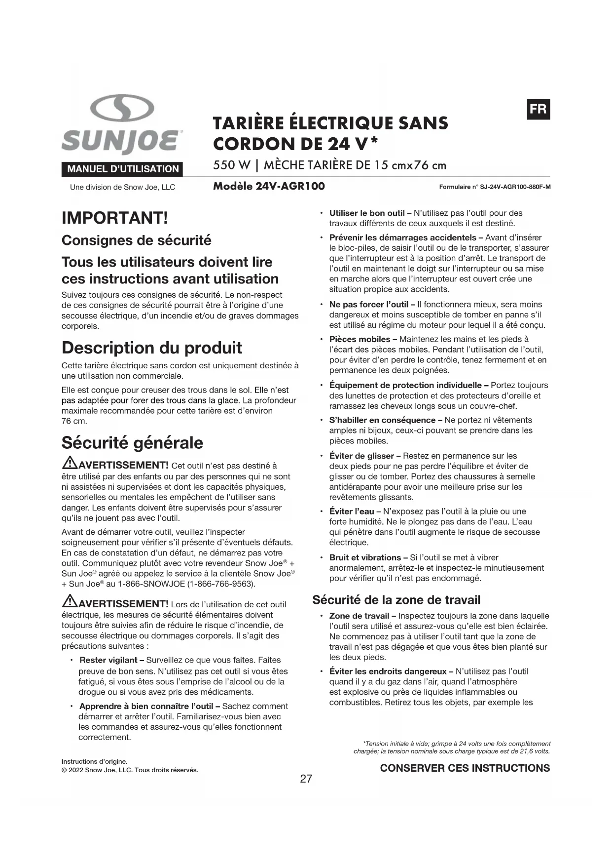 24VAGR100 - Tarière électrique sans fil Sun Joe - Notice d'utilisation et mode d'emploi gratuit