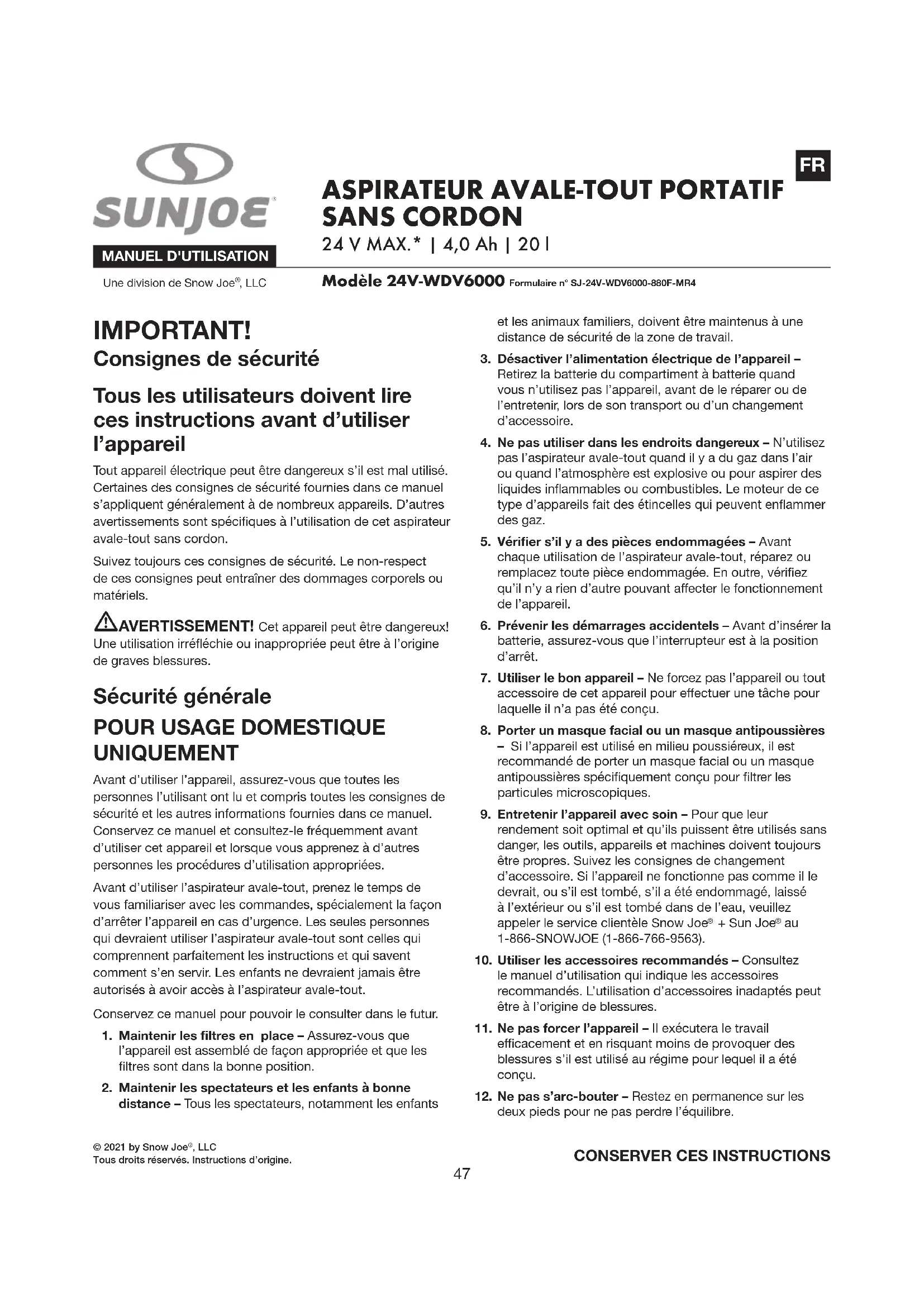 SANS CORDON 24 V MAX.* | 4,0 Ah | 20 l © 2021 by Snow Joe , LLCTous droits réservés. Instructions d’origine.