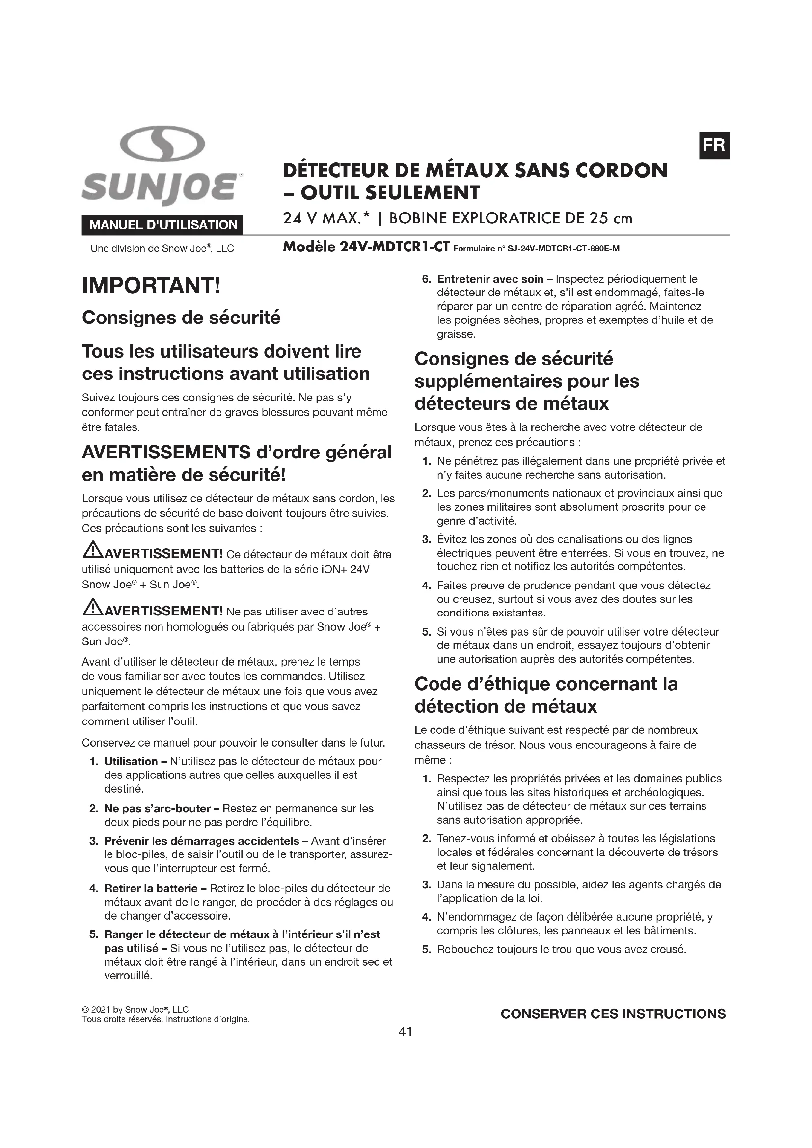 Modèle 24V-MDTCR1-CT Formulaire n° SJ-24V-MDTCR1-CT-880E-M DÉTECTEUR DE MÉTAUX SANS CORDON – OUTIL SEULEMENT 24 V MAX.* | BOBINE EXPLORATRICE DE 25 cm IMPORTANT! Consignes de sécurité Tous les utilisateurs doivent lire ces instructions avant utilisation Suivez toujours ces consignes de sécurité. Ne pas s’y conformer peut entraîner de graves blessures pouvant même être fatales. AVERTISSEMENTS d’ordre général en matière de sécurité! Lorsque vous utilisez ce détecteur de métaux sans cordon, les précautions de sécurité de base doivent toujours être suivies. Ces précautions sont les suivantes : mAVERTISSEMENT! Ce détecteur de métaux doit être utilisé uniquement avec les batteries de la série iON+ 24V Snow Joe