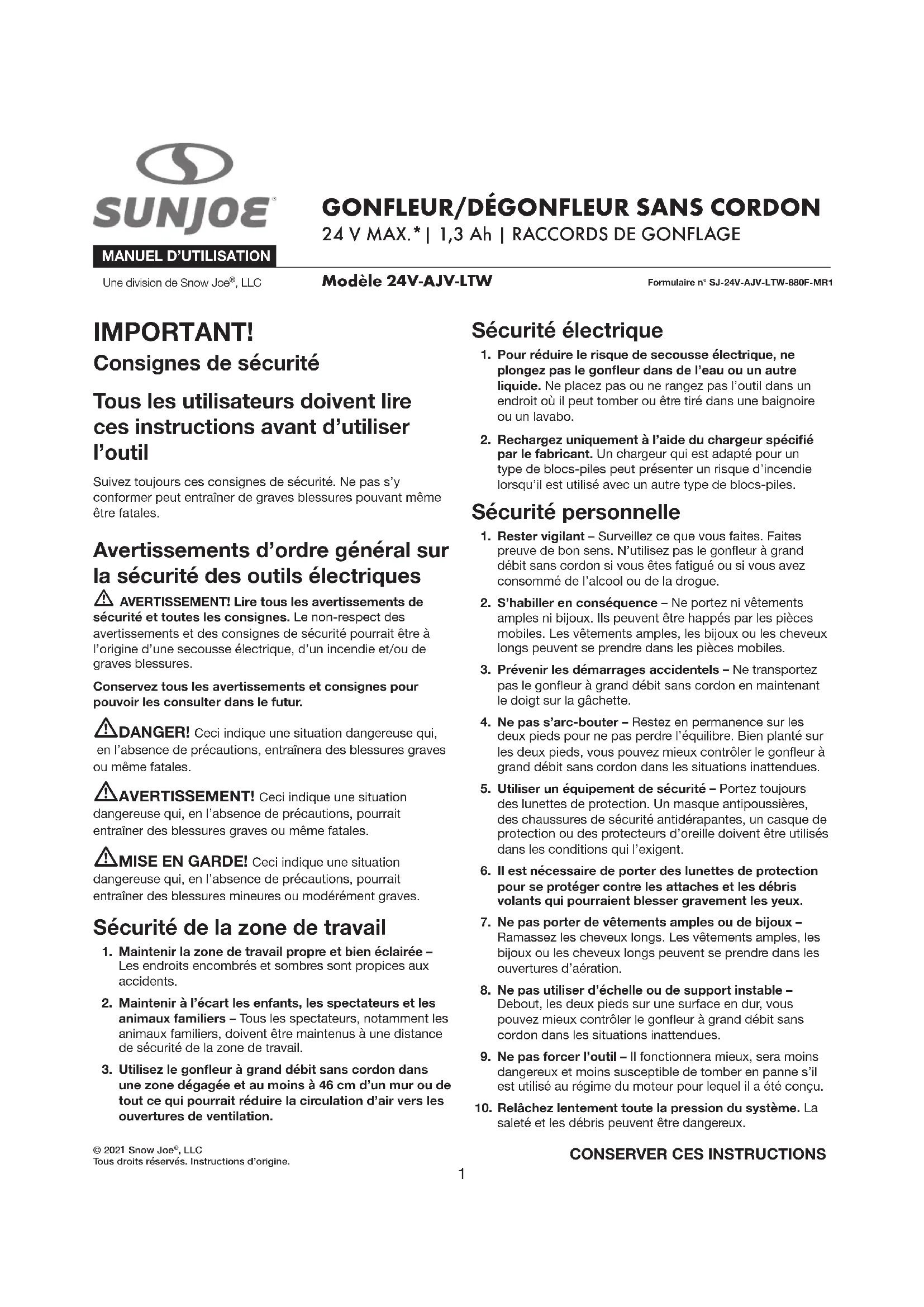 MODE D'EMPLOI 24VAJVLTW Sun Joe