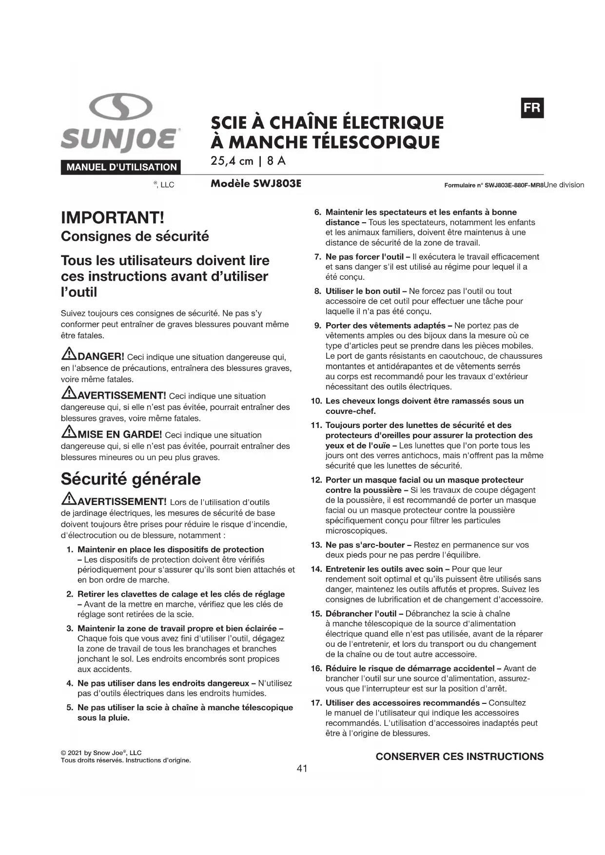 © 2021 by Snow Joe , LLCTous droits réservés. Instructions d’origine. Formulaire n° SWJ803E-880F-MR8Une division de Snow Joe