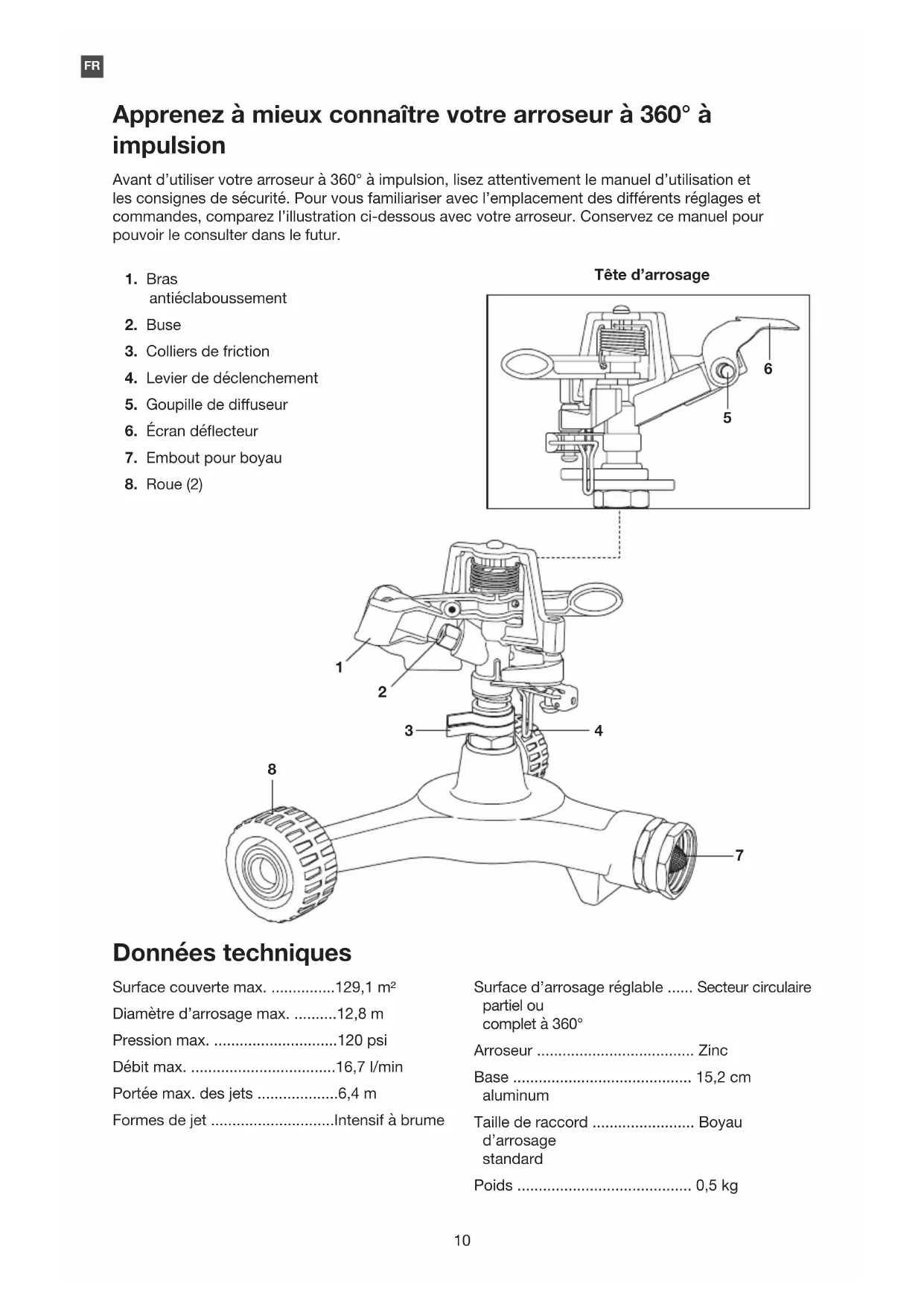Apprenez à mieux connaître votre arroseur à 360° à impulsion Avant d’utiliser votre arroseur à 360° à impulsion, lisez attentivement le manuel d’utilisation et les consignes de sécurité. Pour vous familiariser avec l’emplacement des différents réglages et commandes, comparez l’illustration ci-dessous avec votre arroseur. Conservez ce manuel pour pouvoir le consulter dans le futur. Données techniques Surface couverte max. ...............129,1 m² Diamètre d’arrosage max. ..........12,8 m Pression max. .............................120 psi Débit max. ..................................16,7 l/min Portée max. des jets ...................6,4 m Formes de jet .............................Intensif à brume Surface d’arrosage réglable ...... Secteur circulaire partiel ou complet à 360° Arroseur ..................................... Zinc Base .......................................... 15,2 cm aluminum Taille de raccord ........................ Boyau d’arrosage standard Poids ......................................... 0,5 kg11 Utilisation Réglage de la portée Utilisez l’écran déflecteur pour régler la portée du jet (Fig. 1). Réglage de la rotation Réglez les colliers de friction pour arroser la surface semi-circulaire ou circulaire voulue (5° à 360°) (Fig. 2). Réglage de la surface d’arrosage à 360° Pour une surface d’arrosage circulaire complète (0° - 360°), relevez le levier de déclenchement (Fig. 3). Réglage de la forme du jet Tournez la goupille de diffuseur pour passer d’un jet étroit à une brume large (Fig. 4). Écran déflecteur Fig. 1 1/4 1/2 3/4 Fig. 2 Colliers de friction Fig. 3 Levier de déclenchement Fig. 4 Jet étroit Goupille de diffuseur Brume large12 Transport de l’arroseur Le support à roulettes de 15,2 cm de largeur permet de déplacer facilement l’arroseur d’une zone d’irrigation à une autre (Fig. 5). Branchement du boyau d’arrosage Attachez votre boyau d’arrosage à l’embout sur l’arroseur (Fig. 6). Conseils pour l’arrosage Arrosez uniquement si cela est nécessaire, de préférence le matin afin de réduire au minimum l’évaporation. Pour favoriser la croissance en profondeur des racines, arrosez généreusement, mais peu fréquemment. Pour empêcher le ruissellement d’eau, surveillez la façon dont l’eau est arrosée. REMARQUE : puisque l’eau se dilate quand elle gèle, purgez complètement l’eau des arroseurs et des boyaux d’arrosage afin de ne pas les endommager lorsque la température descend sous 0 °C. Entretien Après utilisation, purgez l’arroseur. NE PAS laisser d’eau geler dans l’arroseur (Fig. 7). Fig. 7 Entretien, réparations et assistance technique Si votre arroseur à 360° à impulsion en zinc Aqua Joe