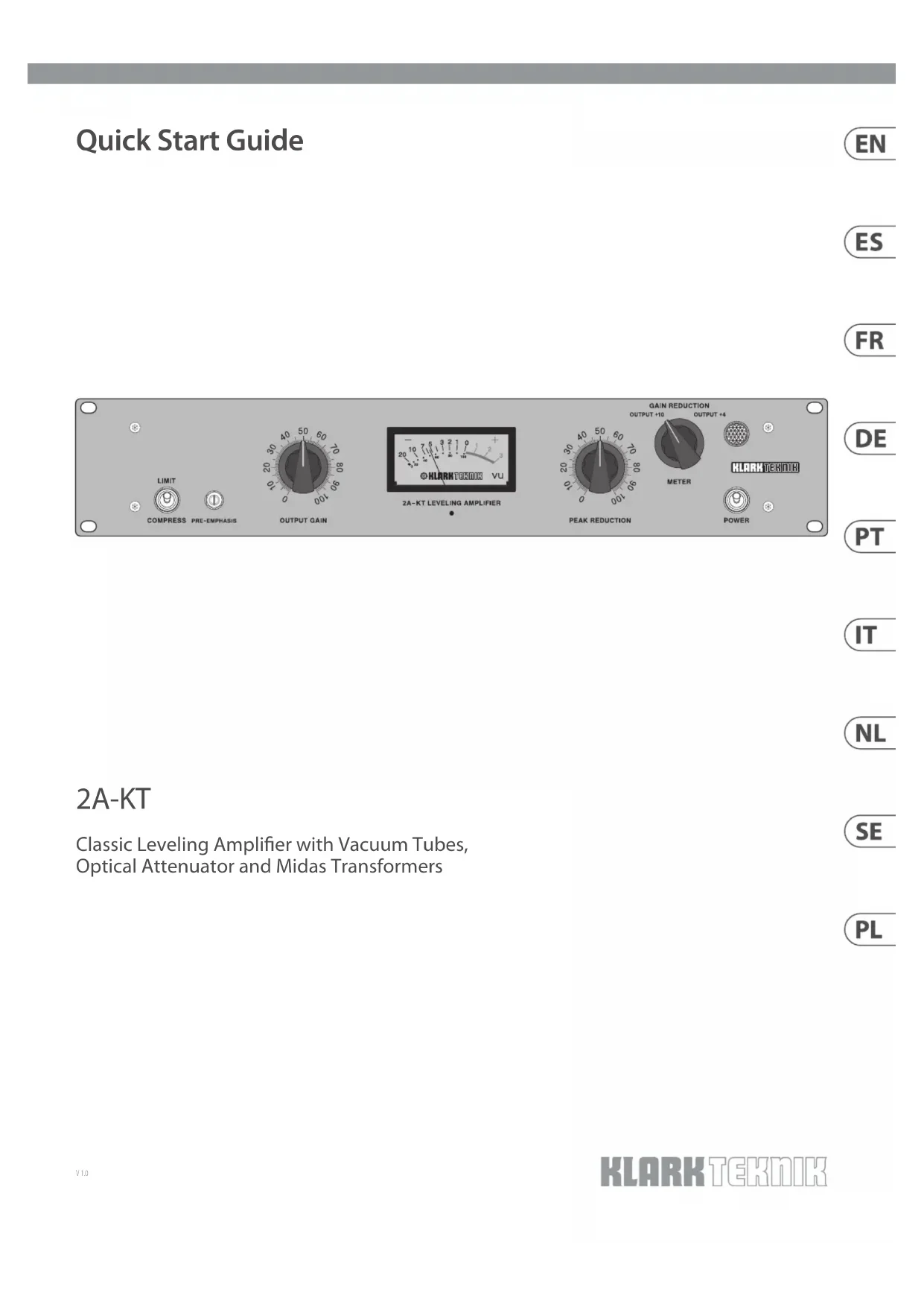 - If one unit shows more reduction than the other, turn that unit’s Stereo Link trimmer clockwise until the meters match. (10) OUTPUTS are available as balanced ¼" and XLR connectors. (11) INPUTS are available as balanced ¼" and locking XLR connectors. 2A-KT Controls14 2A-KT Quick Start Guide 15 2A-KT Controles 2A-KT Réglages (FR) Réglages (ES) Controles (1) LIMITE / COMPRESSE Le commutateur aecte le taux de compression, passant d’un taux de compression xe en mode Compression et passant à un taux presque inni en mode Limite. (2) PRÉ-EMPHASE trimmer ajuste la sidechain à laquelle le compresseur répond, mais n’aecte en aucun cas l’audio directement. Réglé à fond dans le sens des aiguilles d’une montre sur la position «Par défaut», le sidechain répond à toute la bande passante de fréquence de l’audio entrant. Lorsque le trimmer est tourné dans le sens antihoraire, le compresseur répond moins aux transitoires à haute fréquence. (3) GAIN DE SORTIE Le bouton règle le niveau général envoyé par l’unité. (4) VU METER ache le niveau de réduction de gain ou le niveau de sortie, en fonction de l’opération sélectionnée. (5) RÉDUCTION DE POINTE Le bouton contrôle le seuil du compresseur / limiteur. Une réduction de gain maximale de 40 dB est disponible, ce qui est probablement plus que tout scénario pratique ne l’exigerait à moins d’être utilisé dans une conguration de compression parallèle. (6) SÉLECTION DU COMPTEUR Le bouton détermine si le VU Meter ache la quantité de réduction de gain ou le niveau de sortie. Lorsqu’il est réglé sur le mode de niveau de sortie, une lecture de compteur de 0 dB correspond à un niveau de sortie de +4 ou +10 dBu, selon la sélection. (7) PUISSANCE interrupteur allume et éteint l’appareil. La LED s’allumera pour indiquer que l’unité est sous tension. (8) ÉTALONNAGE DU COMPTEUR Le bouton permet d’ajuster le multimètre pour la précision en suivant ces étapes:
