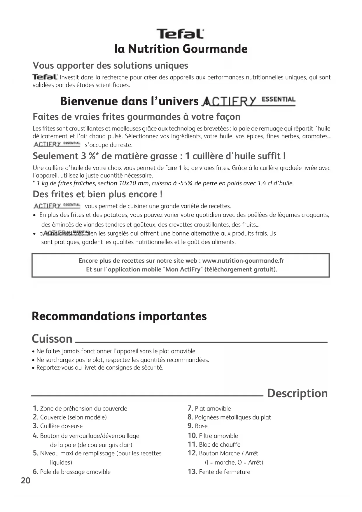 - Reportez-vous au livret de consignes de sécurité. TEFAL903B-ACTIFRY_Essential_1505087843_Mise en page 1 20/12/12 18:54 Page2021