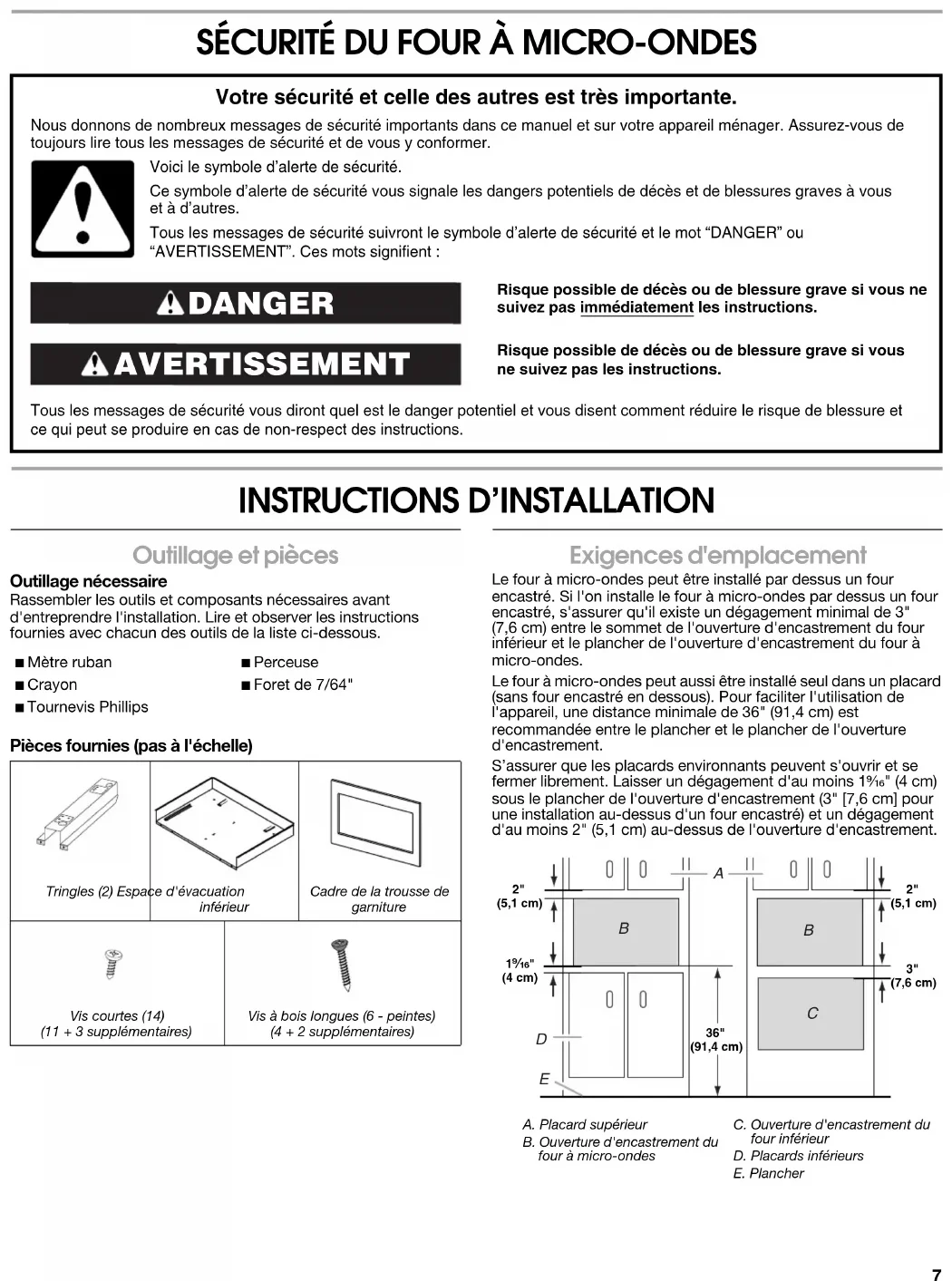 Outillage et pièces Outillage nécessaire Rassembler les outils et composants nécessaires avant d'entreprendre l'installation. Lire et observer les instructions fournies avec chacun des outils de la liste ci-dessous. Pièces fournies (pas à l'échelle) Exigences d'emplacement Le four à micro-ondes peut être installé par dessus un four encastré. Si l'on installe le four à micro-ondes par dessus un four encastré, s'assurer qu'il existe un dégagement minimal de 3" (7,6 cm) entre le sommet de l'ouverture d'encastrement du four inférieur et le plancher de l'ouverture d'encastrement du four à micro-ondes. Le four à micro-ondes peut aussi être installé seul dans un placard (sans four encastré en dessous). Pour faciliter l'utilisation de l'appareil, une distance minimale de 36" (91,4 cm) est recommandée entre le plancher et le plancher de l'ouverture d'encastrement.S’assurer que les placards environnants peuvent s'ouvrir et se fermer librement. Laisser un dégagement d'au moins 1⁹⁄₁₆" (4 cm) sous le plancher de l'ouverture d'encastrement (3" [7,6 cm] pour une installation au-dessus d'un four encastré) et un dégagement d'au moins 2" (5,1 cm) au-dessus de l'ouverture d'encastrement. Risque possible de décès ou de blessure grave si vous ne suivez pas immédiatement les instructions. Risque possible de décès ou de blessure grave si vous ne suivez pas les instructions. Tous les messages de sécurité vous diront quel est le danger potentiel et vous disent comment réduire le risque de blessure et ce qui peut se produire en cas de non-respect des instructions. Votre sécurité et celle des autres est très importante. Nous donnons de nombreux messages de sécurité importants dans ce manuel et sur votre appareil ménager. Assurez-vous de toujours lire tous les messages de sécurité et de vous y conformer. AVERTISSEMENT DANGER Voici le symbole d’alerte de sécurité.Ce symbole d’alerte de sécurité vous signale les dangers potentiels de décès et de blessures graves à vous et à d’autres.Tous les messages de sécurité suivront le symbole d’alerte de sécurité et le mot “DANGER” ou “AVERTISSEMENT”. Ces mots signifient : ■ Mètre ruban■ Crayon■ Tournevis Phillips■ Perceuse■ Foret de 7/64"Tringles (2) Espace d'évacuation inférieurCadre de la trousse de garnitureVis courtes (14)(11 + 3 supplémentaires)Vis à bois longues (6 - peintes)(4 + 2 supplémentaires)A. Placard supérieurB. Ouverture d'encastrement du four à micro-ondesC. Ouverture d'encastrement du four inférieurD. Placards inférieursE. Plancher 3"(7,6 cm)