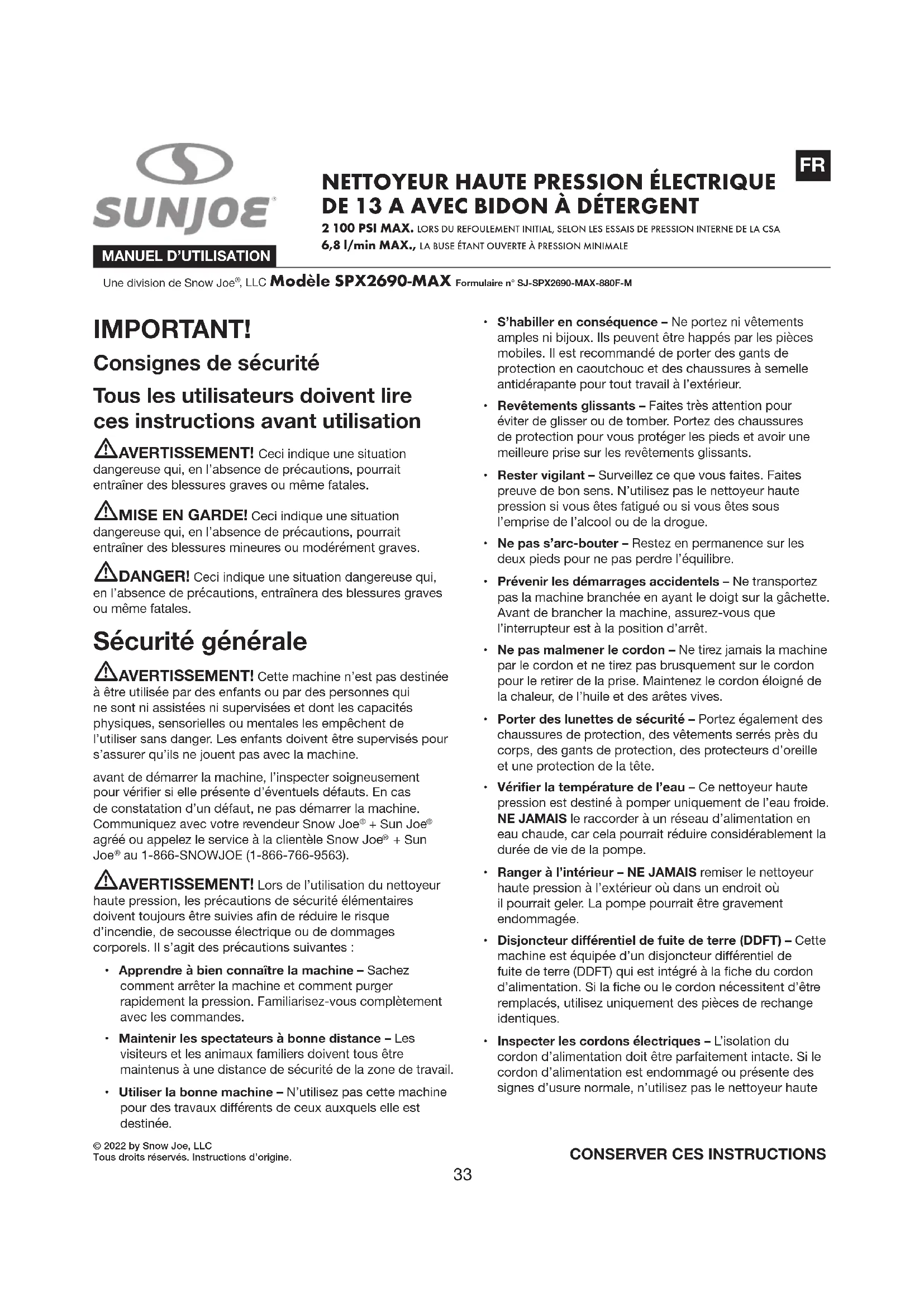 2 100 PSI MAX. LORS DU REFOULEMENT INITIAL, SELON LES ESSAIS DE PRESSION INTERNE DE LA CSA 6,8 l/min MAX., LA BUSE ÉTANT OUVERTE À PRESSION MINIMALE IMPORTANT! Consignes de sécurité Tous les utilisateurs doivent lire ces instructions avant utilisation mAVERTISSEMENT! Ceci indique une situation dangereuse qui, en l’absence de précautions, pourrait entraîner des blessures graves ou même fatales. mMISE EN GARDE! Ceci indique une situation dangereuse qui, en l’absence de précautions, pourrait entraîner des blessures mineures ou modérément graves. mDANGER! Ceci indique une situation dangereuse qui, en l’absence de précautions, entraînera des blessures graves ou même fatales. Sécurité générale mAVERTISSEMENT! Cette machine n’est pas destinée à être utilisée par des enfants ou par des personnes qui ne sont ni assistées ni supervisées et dont les capacités physiques, sensorielles ou mentales les empêchent de l’utiliser sans danger. Les enfants doivent être supervisés pour s’assurer qu’ils ne jouent pas avec la machine. avant de démarrer la machine, l’inspecter soigneusement pour vérier si elle présente d’éventuels défauts. En cas de constatation d’un défaut, ne pas démarrer la machine. Communiquez avec votre revendeur Snow Joe