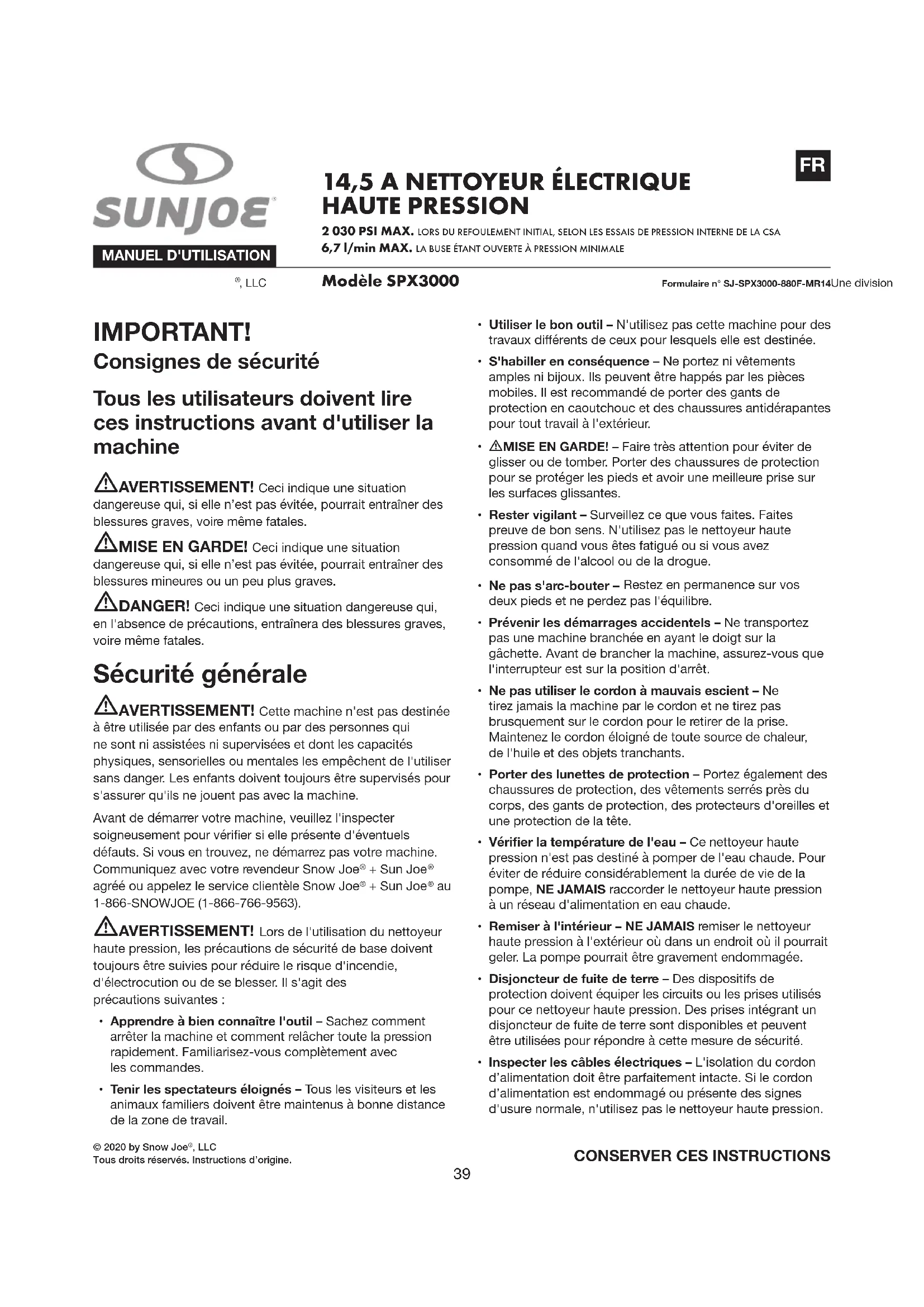 1-866-SNOWJOE (1-866-766-9563). mAVERTISSEMENT! Lors de l'utilisation du nettoyeur haute pression, les précautions de sécurité de base doivent toujours être suivies pour réduire le risque d'incendie, d'électrocution ou de se blesser. Il s'agit des précautions suivantes :