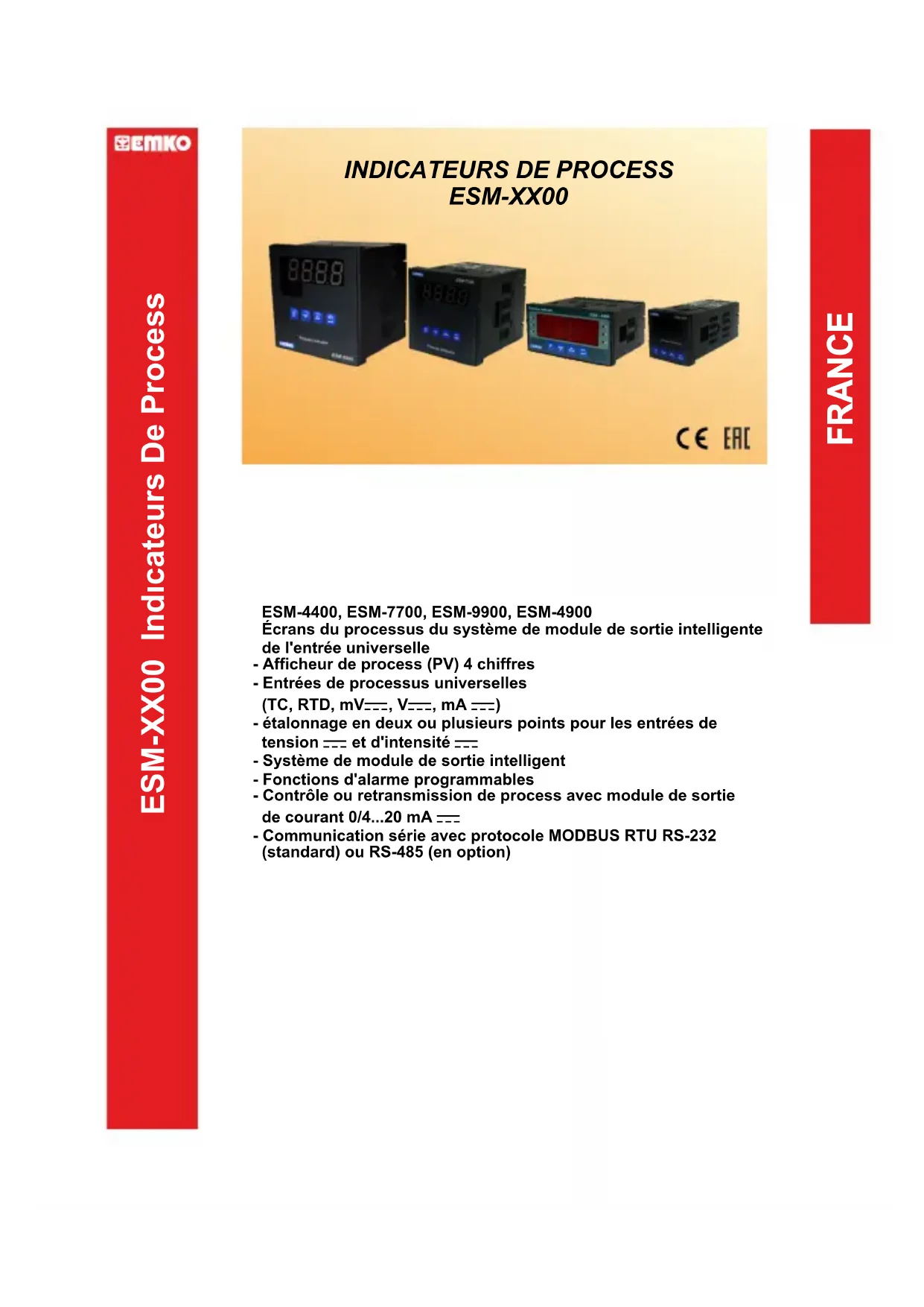 Entrée universelle : Tension/courant TC, RTD, Z Thermocouple (TC) : L(DIN 43710), J, K, R, S, T, B, E et N (IEC584.1)(ITS90), C (ITS90) Thermo resistance (RTD) : PT-100 (IEC751)(ITS90) Entrée Z : mV, V, mA Plage de mesure : Veuillez vous reporter au tableau 1 pour la sélection du type et de l'échelle d'entrée Précision : ± 0,25% de la pleine échelle pour l'entrée du thermocouple, de la thermorésistance, mV, V et mA. Compensation soudure froide : Automatiquement ±0,1°C/1°C Compensation de ligne : Maximum 10 Ohm Protection contre la rupture du capteur : Haut de gamme Fréquence de scrutation : 3 échantillons par seconde Filtre d'entrée : 0,0 à 900,0 secondes SORTIE Sortie relais standard : 5 A @ 250 VV (sur charge résistive) Modules de sortie : L'utilisateur peut raccorder 2 modules de sortie à l'appareil. -Module de sortie relais -Module de sortie SSR (Max. 26 mA, Max. 22 V Z) -Module de sortie (transistor) numérique (Max. 40 mA @ 18 VZ) -Module de sortie courant 0/4...20 mA Z AFFICHAGE Affichage de process : ESM-4400 : Afficheur DEL rouge 4 chiffres 10,1 mm ESM-4900 : Afficheur DEL rouge 4 chiffres 20,3 mm ESM-7700 : Afficheur DEL rouge 4 chiffres 13,2 mm ESM-9900 : Afficheur DEL rouge 4 chiffres 19 mm L’indicateurs DEL : DEL (état de sortie) °C /°F / V, OP1/2/3. ALIMENTATION Tension d'alimentation : 100-240 V V 50/60 Hz (-%15;+%10) -6 VA 24 V V 50/60 Hz (-%15 ; +%10) -6 VA 24 V Z (-%15 ; +%10) -6 W (elle doit être déterminée dans l'ordre.) 2ENGLISH FRANCE ÉVALUATION ENVIRONNEMENTALE ET CARACTÉRISTIQUES PHYSIQUESTempérature de fonctionnement : 0...50°C Humidité : 0-90%RH (sans condensation) Classe de protection : IP65 à l'avant, IP20 à l'arrière. Montage : Boîtier de type 1 Installation : Installation fixe de catégorie II Catégorie de surtension : II Degré de pollution : II, bureau ou lieu de travail, pollution non-conductrice