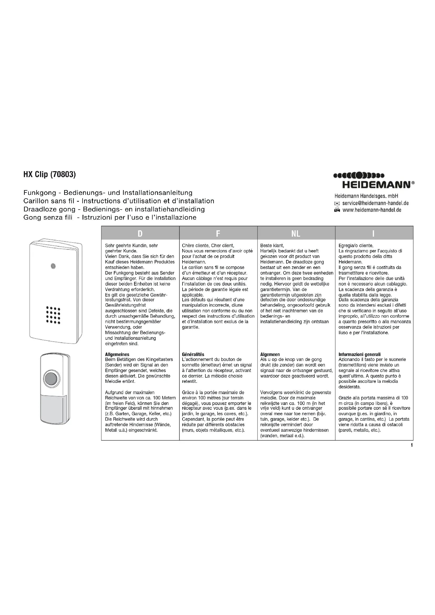m circa (in campo libero) , è possibile portare con sè il ricevitore ovunque (p.es. in giardino, in garage, in cantina, etc.) La portata viene ridotta a causa di ostacoli (pareti, metallo, etc.). Chère cliente, Cher client, Nous vous remercions d’avoir opté pour l’achat de ce produit Heidemann. Le carillon sans fil se compose d’un émetteur et d’un récepteur. Aucun càblage n’est requis pour l’installation de ces deux unités. La période de garantie légale est applicable. Les défauts qui résultent d’une manipulation incorrecte, díune utilisation non conforme ou du non respect des instructions d’utilisation et d’installation sont exclus de la garantie. Généralités L’actionnement du bouton de sonnette (émetteur) émet un signal à l’attention du récepteur, activant ce dernier. La mélodie choisie retentit. Gràce à la portée maximale de environ 100 mètres (sur terrain dégagé) , vous pouvez emporter le récepteur avec vous (p.ex. dans le jardin, le garage, les caves, etc.). Cependant, la portée peut être réduite par différents obstacles (murs, objets métalliques, etc.). 1NLFD