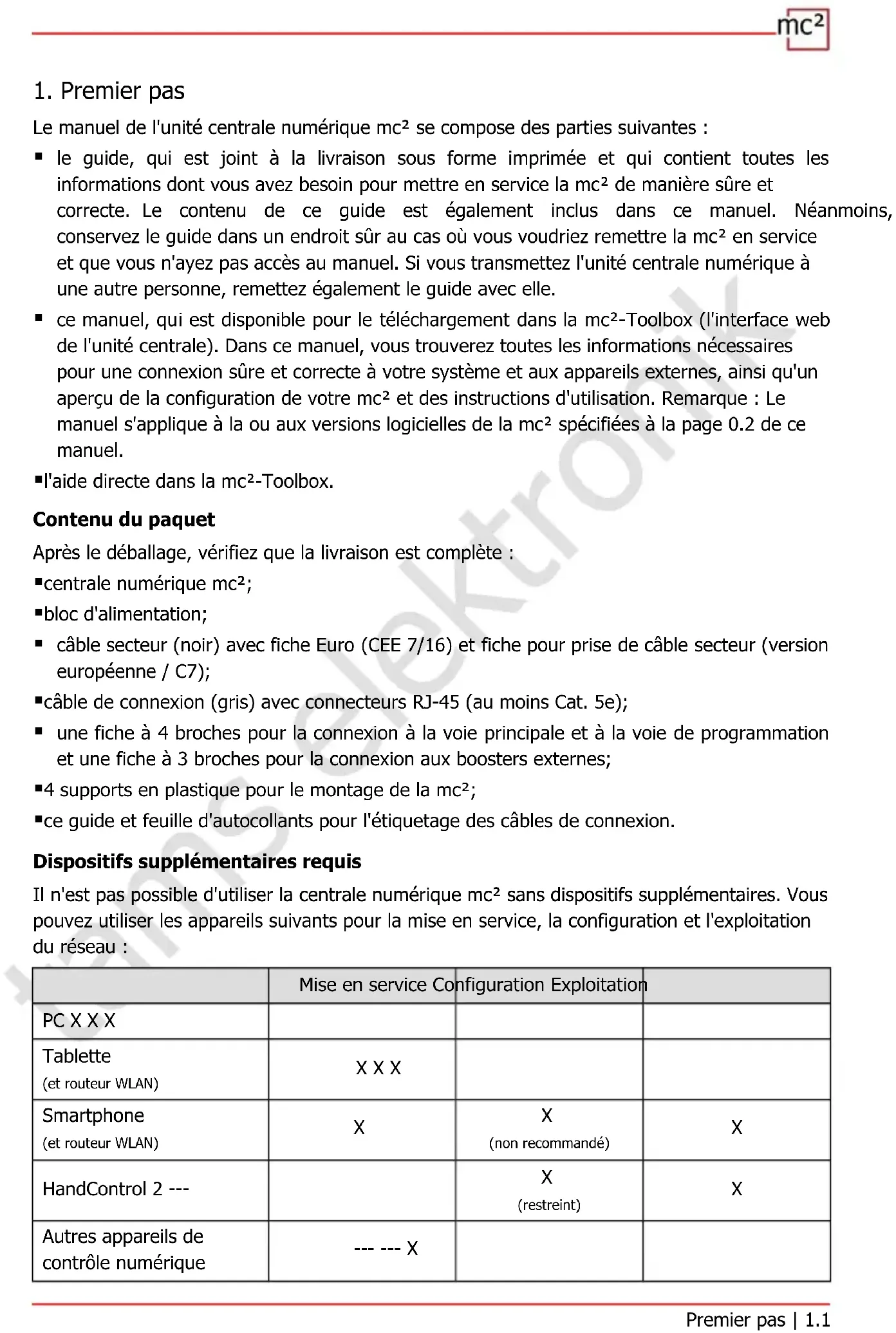 Le manuel de l'unité centrale numérique mc² se compose des parties suivantes : le guide, qui est joint à la livraison sous forme imprimée et qui contient toutes les informations dont vous avez besoin pour mettre en service la mc² de manière sûre et correcte. Le contenu de ce guide est également inclus dans ce manuel. Néanmoins, conservez le guide dans un endroit sûr au cas où vous voudriez remettre la mc² en service et que vous n'ayez pas accès au manuel. Si vous transmettez l'unité centrale numérique à une autre personne, remettez également le guide avec elle. ce manuel, qui est disponible pour le téléchargement dans la mc²-Toolbox (l'interface web de l'unité centrale). Dans ce manuel, vous trouverez toutes les informations nécessaires pour une connexion sûre et correcte à votre système et aux appareils externes, ainsi qu'un aperçu de la configuration de votre mc² et des instructions d'utilisation. Remarque : Le manuel s'applique à la ou aux versions logicielles de la mc² spécifiées à la page 0.2 de ce manuel. l'aide directe dans la mc²-Toolbox. Contenu du paquet Après le déballage, vérifiez que la livraison est complète : centrale numérique mc²; bloc d'alimentation; câble secteur (noir) avec fiche Euro (CEE 7/16) et fiche pour prise de câble secteur (version européenne / C7); câble de connexion (gris) avec connecteurs RJ-45 (au moins Cat. 5e); une fiche à 4 broches pour la connexion à la voie principale et à la voie de programmation et une fiche à 3 broches pour la connexion aux boosters externes; 4 supports en plastique pour le montage de la mc²; ce guide et feuille d'autocollants pour l'étiquetage des câbles de connexion. Dispositifs supplémentaires requis Il n'est pas possible d'utiliser la centrale numérique mc² sans dispositifs supplémentaires. Vous pouvez utiliser les appareils suivants pour la mise en service, la configuration et l'exploitation du réseau : Mise en service Configuration Exploitation PC X X X Tablette (et routeur WLAN) X X X Smartphone (et routeur WLAN)