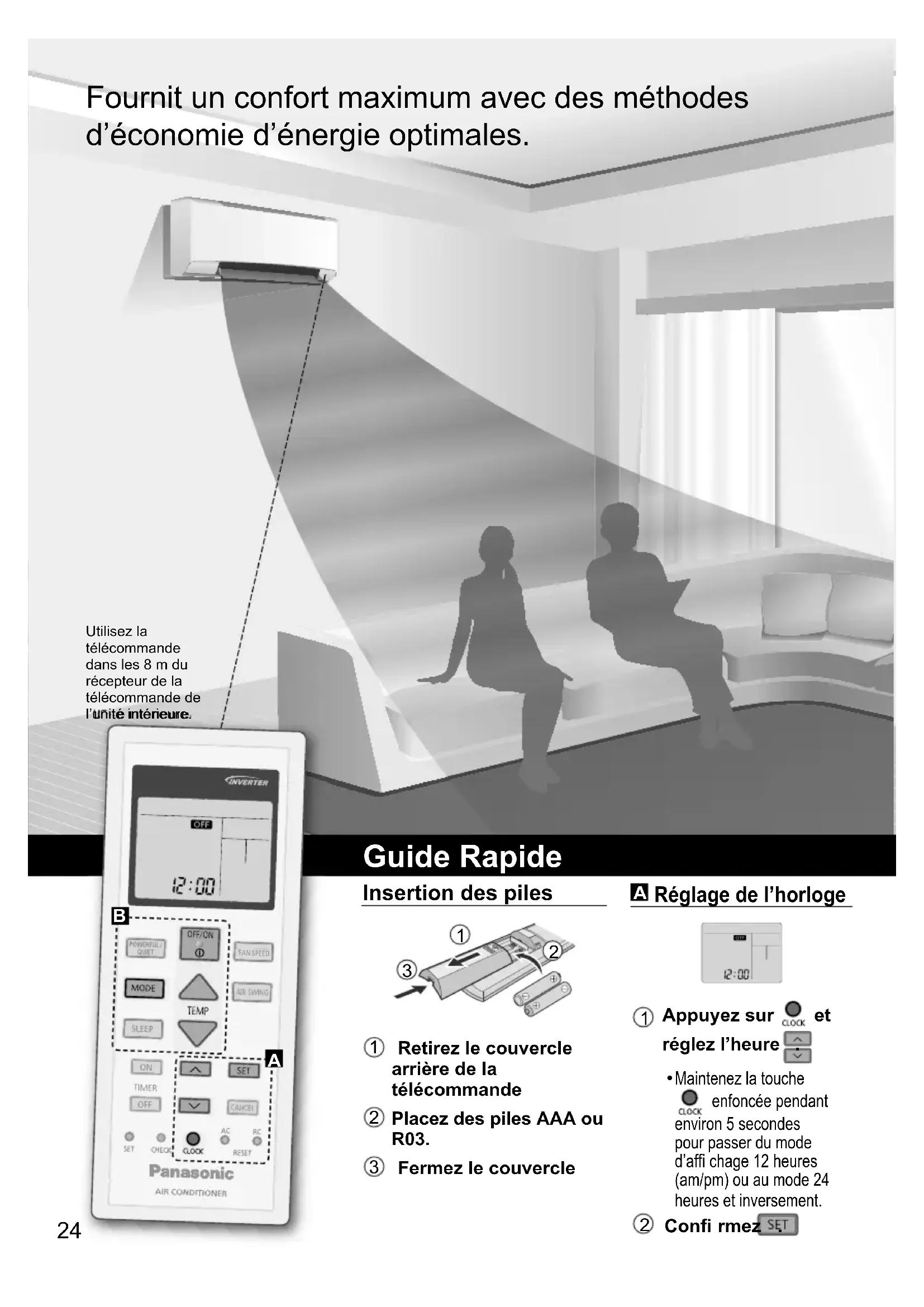 Pour les utilisateurs professionnels au sein de l’Union européenne Si vous souhaitez vous défaire de pieces d’équipement électrique ou électronique, veuillez vous renseigner directement auprès de votre détaillant ou de votre fournisseur. [Information relative à l’élimination des déchets dans les pays extérieurs à l’Union européenne] Ce pictogramme n’est valide qu’à l’intérieur de l’Union européenne. Pour connaître la procédure applicable dans les pays hors Union Européenne, veuillez vous renseigner auprès des autorités locales compétentes ou de votre distributeur. Note relative au pictogramme à apposer sur les piles (voir les 2 exemples cicontre): Le pictogramme représentant une poubelle sur roues barrée d’une croix est conforme à la réglementation. Si ce pictogramme est combiné avec un symbole chimique, il remplit également les exigences posées par la Directive relative au produit chimique concerné. Dépannage / Informations AVERTISSEMENT Ce symbole indique que cet équipement utilise un réfrigérant infl ammable. Il existe un risque d’infl ammation en cas de fuite du réfrigérant en présence d’une source d’infl ammation externe. Ce symbole indique que le manuel d’instruction doit être lu attentivement. Ce symbole indique qu’un personnel d’entretien doit manipuler cet équipement en se référant au manuel d’installation. Ce symbole indique que certaines informations sont incluses dans le manuel d’utilisation et/ou manuel d’installation.46 Ofrece máximo confort con métodos óptimos de ahorro energético. Utilice el mando a distancia a un máximo de 8 metros desde el receptor del mando a distancia de la unidad interior. Guía Rápida Colocación de las pilas