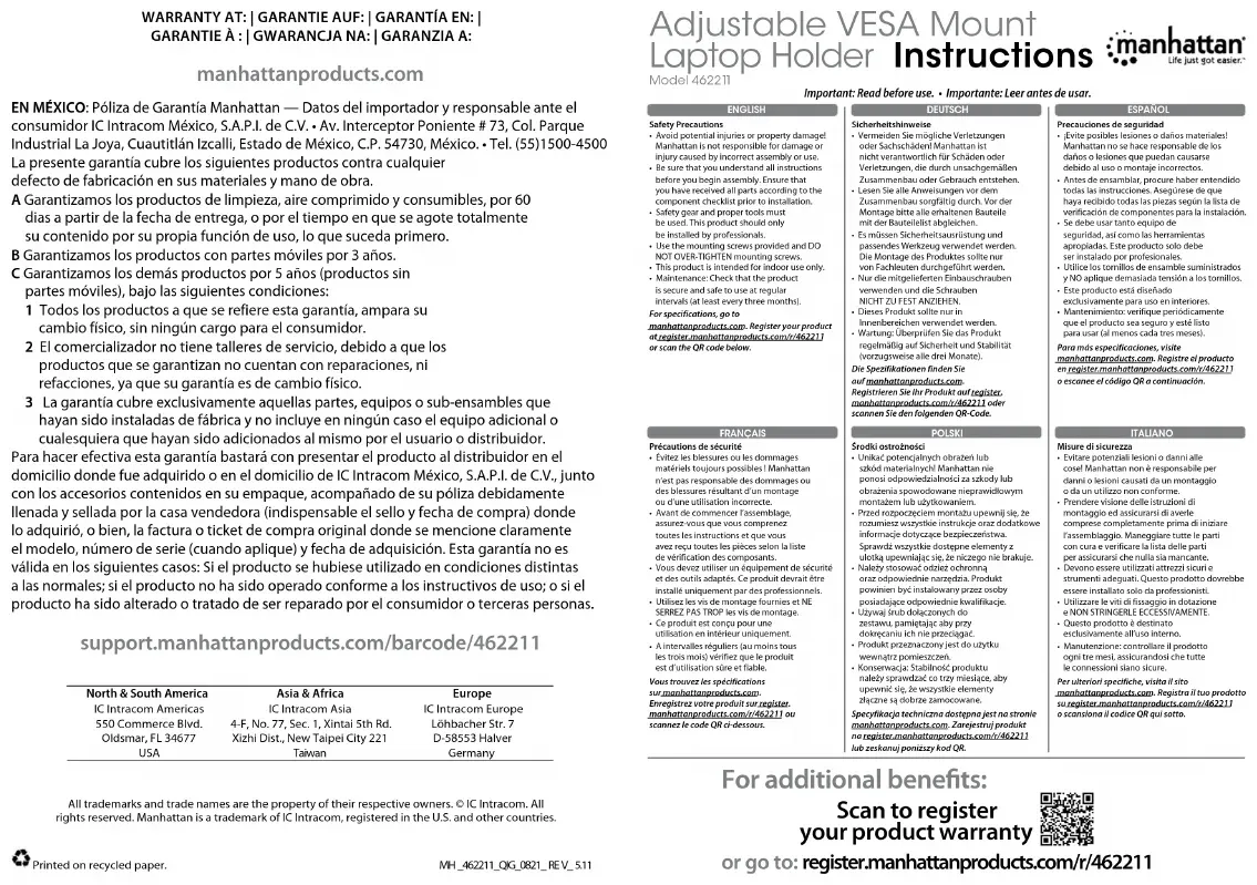 Le MANHATTAN 462211 est généralement accompagné d'une garantie limitée de 2 ans. Pour des informations spécifiques concernant votre produit, veuillez consulter la documentation fournie ou contacter le service après-vente.