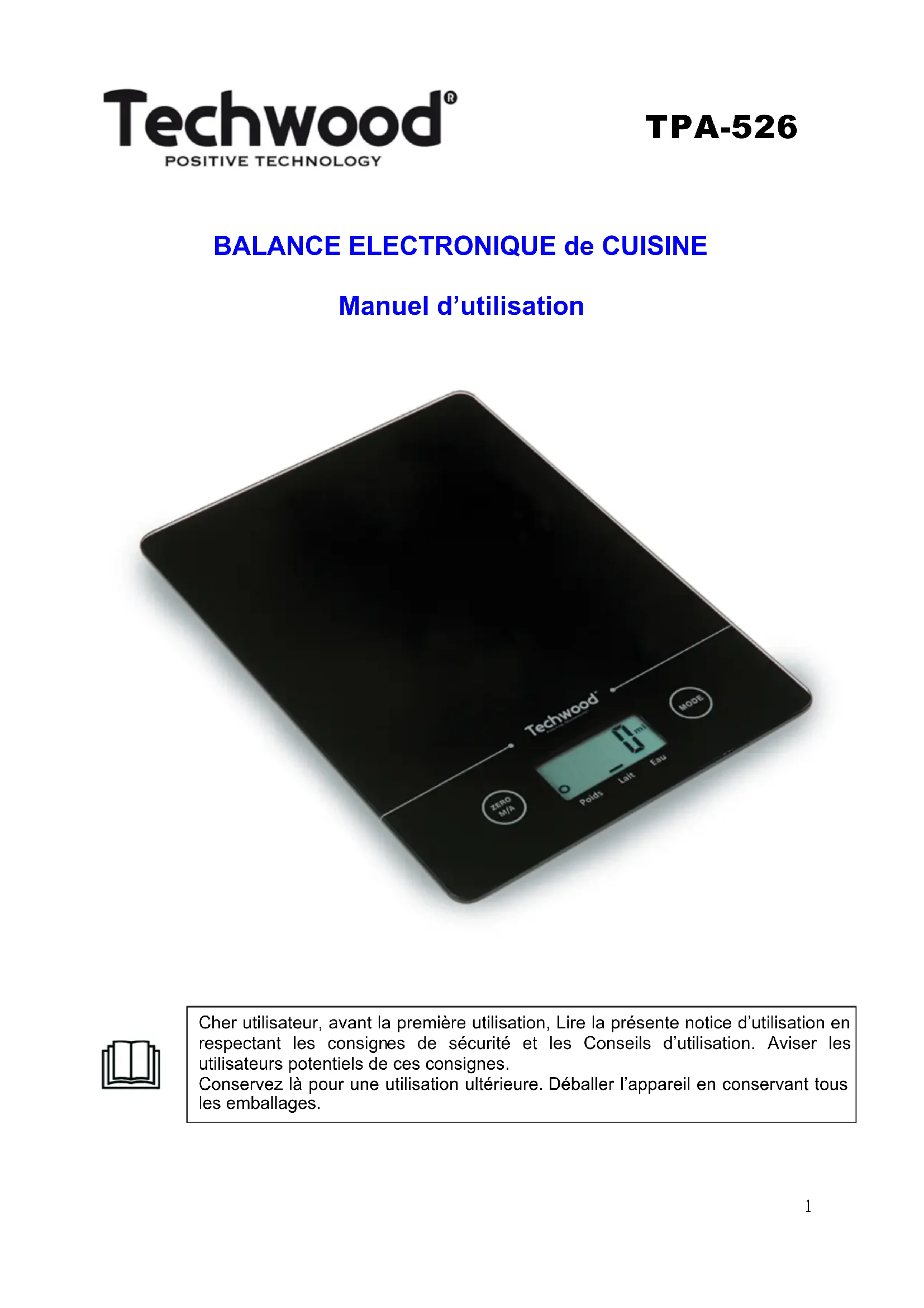 BALANCE ELECTRONIQUE de CUISINE Manuel d’utilisation TPA-526 Cher utilisateur, avant la première utilisation, Lire la présente notice d’utilisation en respectant les consign es de sécurité et les Conseils d’utilisation. Aviser les utilisateurs potentiels de ces consignes. Conservez là pour une utilisation ultérieure. Déballer l’appareil en conservant tous les emballages.2