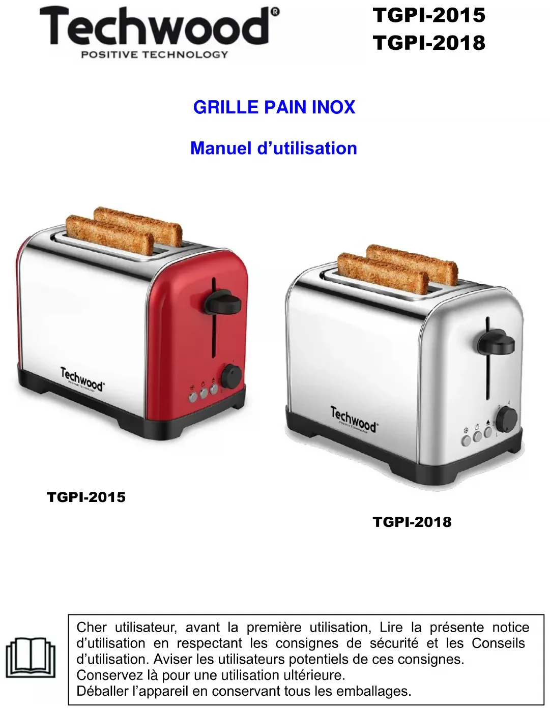 Cher utilisateur, avant la première utilisation, Lire la présente notice d’utilisation en respectant les consignes de sécurité et les Conseils d’utilisation. Aviser les utilisateurs potentiels de ces consignes. Conservez là pour une utilisation ultérieure. Déballer l’appareil en conservant tous les emballages. TGPI-2015 TGPI-2018