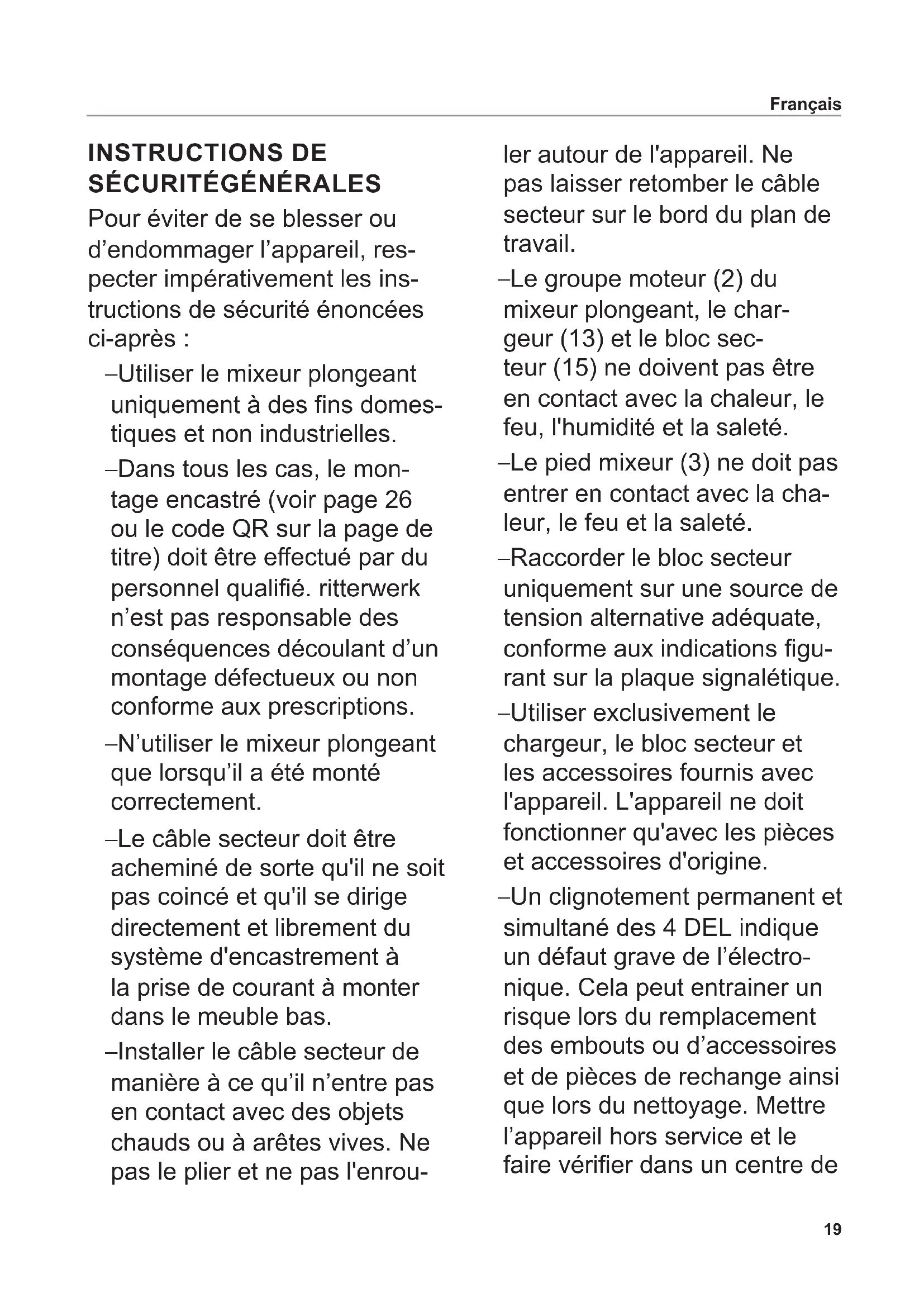 Pour éviter de se blesser ou d’endommager l’appareil, res- pecter impérativement les ins- tructions de sécurité énoncées ci-après : – Utiliser le mixeur plongeant uniquement à des ns domes- tiques et non industrielles. – Dans tous les cas, le mon- tage encastré (voir page 26 ou le code QR sur la page de titre) doit être eectué par du personnel qualié. ritterwerk n’est pas responsable des conséquences découlant d’un montage défectueux ou non conforme aux prescriptions. – N’utiliser le mixeur plongeant que lorsqu’il a été monté correctement. – Le câble secteur doit être acheminé de sorte qu'il ne soit pas coincé et qu'il se dirige directement et librement du système d'encastrement à la prise de courant à monter dans le meuble bas. – Installer le câble secteur de manière à ce qu’il n’entre pas en contact avec des objets chauds ou à arêtes vives. Ne pas le plier et ne pas l'enrou- ler autour de l'appareil. Ne pas laisser retomber le câble secteur sur le bord du plan de travail. – Le groupe moteur (2) du mixeur plongeant, le char- geur (13) et le bloc sec- teur (15) ne doivent pas être en contact avec la chaleur, le feu, l'humidité et la saleté. – Le pied mixeur (3) ne doit pas entrer en contact avec la cha- leur, le feu et la saleté. – Raccorder le bloc secteur uniquement sur une source de tension alternative adéquate, conforme aux indications gu- rant sur la plaque signalétique. – Utiliser exclusivement le chargeur, le bloc secteur et les accessoires fournis avec l'appareil. L'appareil ne doit fonctionner qu'avec les pièces et accessoires d'origine. – Un clignotement permanent et simultané des 4 DEL indique un défaut grave de l’électro- nique. Cela peut entrainer un risque lors du remplacement des embouts ou d’accessoires et de pièces de rechange ainsi que lors du nettoyage. Mettre l’appareil hors service et le faire vérier dans un centre de Français20 service après-vente agréé. Ne saisir en aucun cas l’embout. Il ne serait alors plus possible de charger l’accumulateur. – Cet appareil ne doit pas être utilisé par des enfants. L’ap- pareil et son cordon d’alimen- tation doivent être tenus éloi- gnés des enfants. – L’appareil peut être utilisé par des personnes ayant des capacités physiques, senso- rielles ou mentales réduites ou ne disposant pas de l’ex- périence et/ou des connais- sances requises, à condition qu’elles soient surveillées ou qu’elles aient reçu des instruc- tions sur l’utilisation et soient conscientes des dangers qui en résultent. – Les enfants ne doivent pas jouer avec l’appareil. – Utiliser l'appareil uniquement lorsqu'il se trouve dans un récipient à fond plat. – Le mixeur plongeant ne doit pas être immergé dans la pré- paration au-delà du point de jonction entre le pied mixeur et le groupe moteur. – Ne jamais laisser l’appareil hors surveillance lorsqu’il est en service. – Ne jamais immerger le mixeur plongeant complet, le chargeur et le bloc secteur dans l'eau ou tout autre liquide. Ne pas exposer l’appareil à la pluie ou à d’autres sources d’humi- dité. Néanmoins, si l’appareil devait tomber dans l’eau, débrancher le bloc secteur du chargeur à partir de la prise de courant, puis sortir l’appareil de l’eau. Faire ensuite vérier l’appareil complet dans un centre de service après-vente agréé avant de le remettre en marche. – Ne jamais utiliser l’appareil avec des mains humides. Ne pas l’employer lorsqu’il est humide ou mouillé, ou si vous vous trouvez sur un sol humide. Ne pas utiliser l’appa- reil en plein air. – Le mixeur plongeant et le chargeur ne doivent pas être nettoyés au lave-vaisselle. – Lors du fonctionnement du mixeur plongeant, ne jamais toucher les embouts et ne pas introduire d'objet dans le mixeur. Français21 Risques de blessures – En cas de panne du chargeur, débrancher toujours le bloc secteur de la prise de courant. Tirer sur la che et non sur le câble. – Pour éviter tout danger, ces- ser aussitôt d’utiliser l’appa- reil lorsque certains de ses éléments sont endommagés. Faire ensuite vérier l’appa- reil complet dans un centre de service après-vente agréé avant de le remettre en marche. – Si le bloc secteur ou le câble secteur est endommagé, il doit être remplacé par une pièce d'origine disponible auprès du fabricant ou de son service après-vente national. – Ne jamais mettre sous tension le mixeur plongeant lorsque vous le nettoyez, lorsque vous installez ou retirez les embouts ou lorsque vous remplacez les accessoires ou pièces de rechange. Pour cela, veiller à tenir les doigts éloignés des touches. Ne pas toucher les lames des embouts, elles sont très tranchantes. Français – Des produits alimentaires peuvent être projetés lors de l'utilisation de l'appareil. Par conséquent, laisser les produits alimentaires chauds refroidir avant de les transfor- mer pour éviter toute brûlure. – Si vous utilisez le mixeur plon- geant dans une casserole, la retirer de la table de cuisson. – Veiller à ce que la cavité sur les embouts s'emboîte parfai- tement sur la tige de l'arbre d'entraînement. Ne pas utiliser d'embouts lâches, mal xés. Dans ce cas, les remplacer. Risque d'explosion – Protéger les accumulateurs de la chaleur et du feu.22 Déplier les graphiques qui se trouvent dans la partie avant et arrière au dos du manuel. Lire attentivement le mode d’emploi avant la mise en service de l’appareil. Conserver le mode d’emploi et le laisser avec l’appa- reil lorsque celui-ci est vendu. La dernière version du mode d’emploi est également dispo- nible sous www.ritterwerk.de. USAGE CONFORME Le mixeur plongeant sert à mixer, hacher ou mélanger des produits alimentaires courants et adaptés. Le mixeur plongeant est conçu pour le contact avec les denrées alimentaires. Utiliser le mixeur plongeant uni- quement à de
