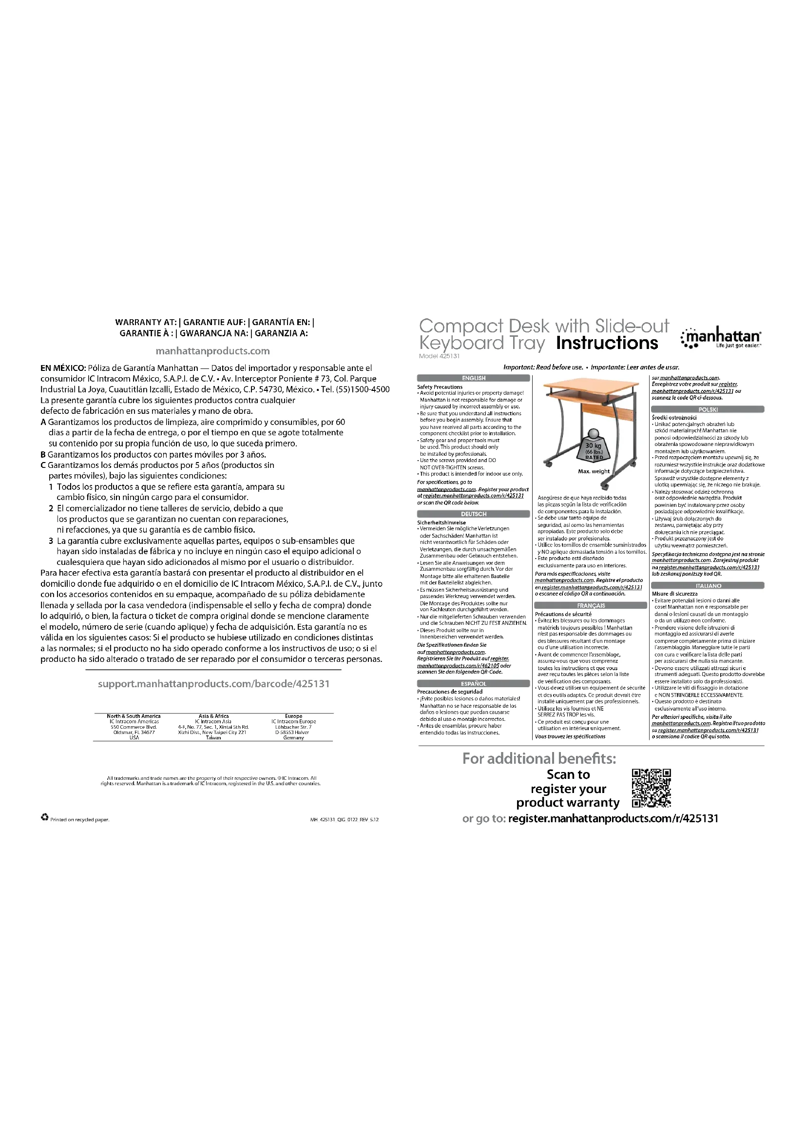 - Ce produit est conçu pour une utilisation en intérieur uniquement. Vous trouvez les spécifications sur manhattanproducts.com. Enregistrez votre produit sur register. manhattanproducts.com/r/425131 ou scannez le code QR ci-dessous. POLSKI Środki ostrożności