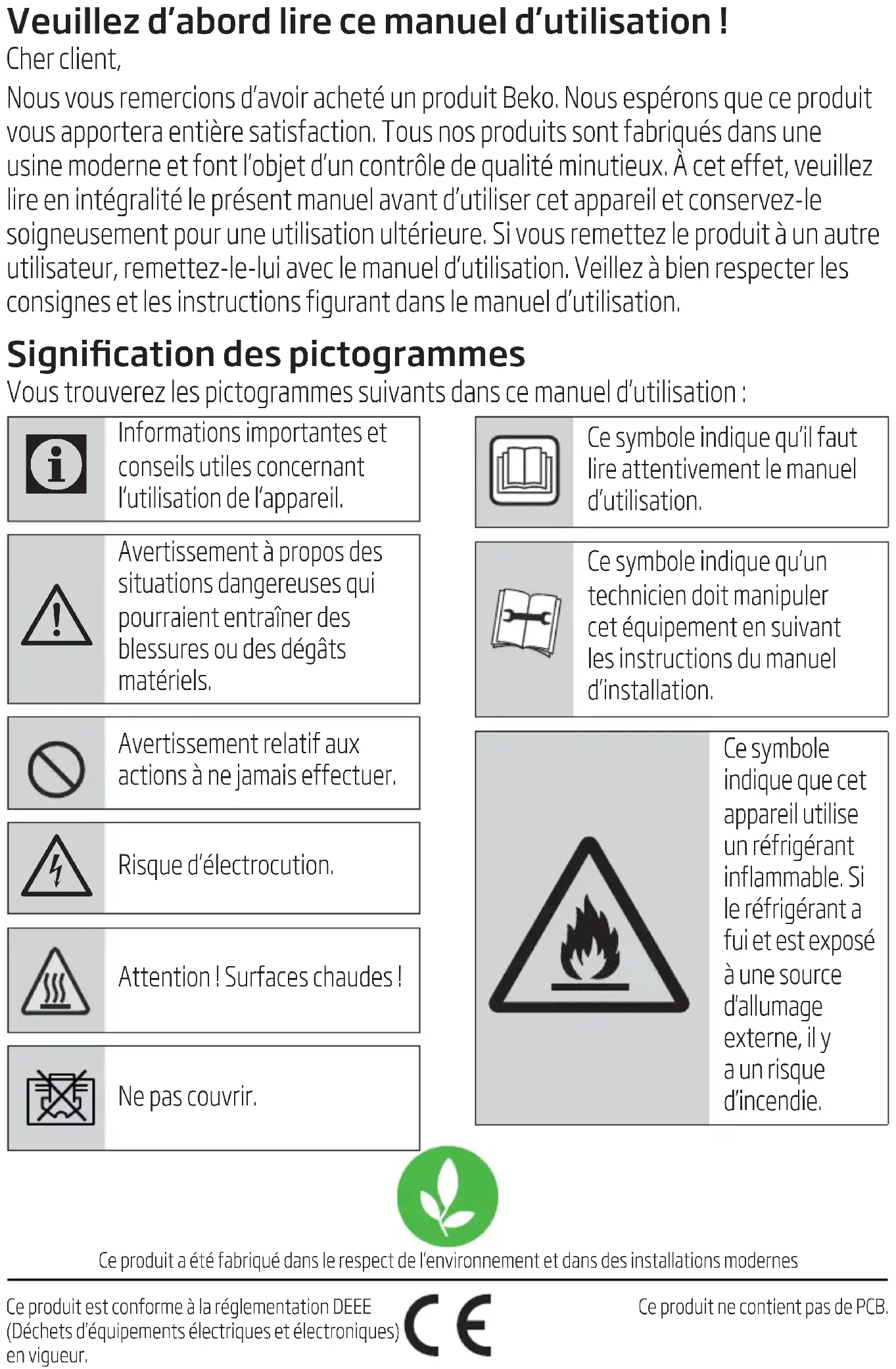 Rated value is tested under 35/24(In.)35/24(Out). 13 SpecificationsManufactured by Arcelik A.S. Karaagac Cd. No:2-6 34445 Sutluce, Beyoglu, Istanbul, Turkey.Veuillez d’abord lire ce manuel d’utilisation ! Cher client, Nous vous remercions d’avoir acheté un produit Beko. Nous espérons que ce produit vous apportera entière satisfaction. Tous nos produits sont fabriqués dans une usine moderne et font l’objet d’un contrôle de qualité minutieux. À cet effet, veuillez lire en intégralité le présent manuel avant d’utiliser cet appareil et conservez-le soigneusement pour une utilisation ultérieure. Si vous remettez le produit à un autre utilisateur, remettez-le-lui avec le manuel d’utilisation. Veillez à bien respecter les consignes et les instructions figurant dans le manuel d’utilisation. Signication des pictogrammes Vous trouverez les pictogrammes suivants dans ce manuel d’utilisation: Ce produit a été fabriqué dans le respect de l’environnement et dans des installations modernesCe produit est conforme à la réglementation DEEE (Déchets d’équipements électriques et électroniques) en vigueur.Ce produit ne contient pas de PCB.