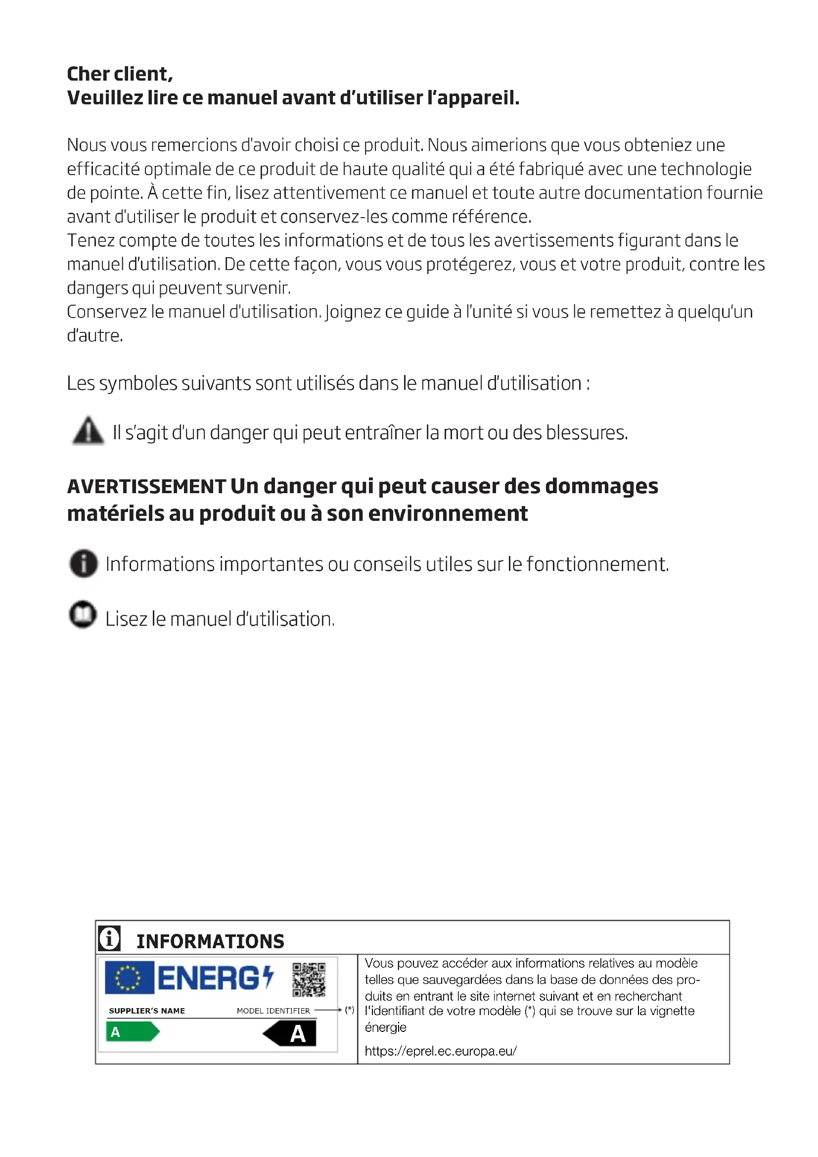 Vous pouvez accéder aux informations relatives au modèle telles que sauvegardées dans la base de données des pro-duits en entrant le site internet suivant et en recherchant l'identifiant de votre modèle (*) qui se trouve sur la vignette énergiehttps://eprel.ec.europa.eu/
