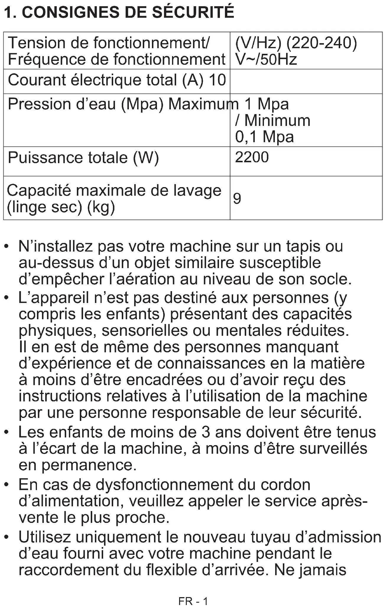 - Ne raccordez pas votre machine à laver au réseau électrique à l’aide d’une rallonge.