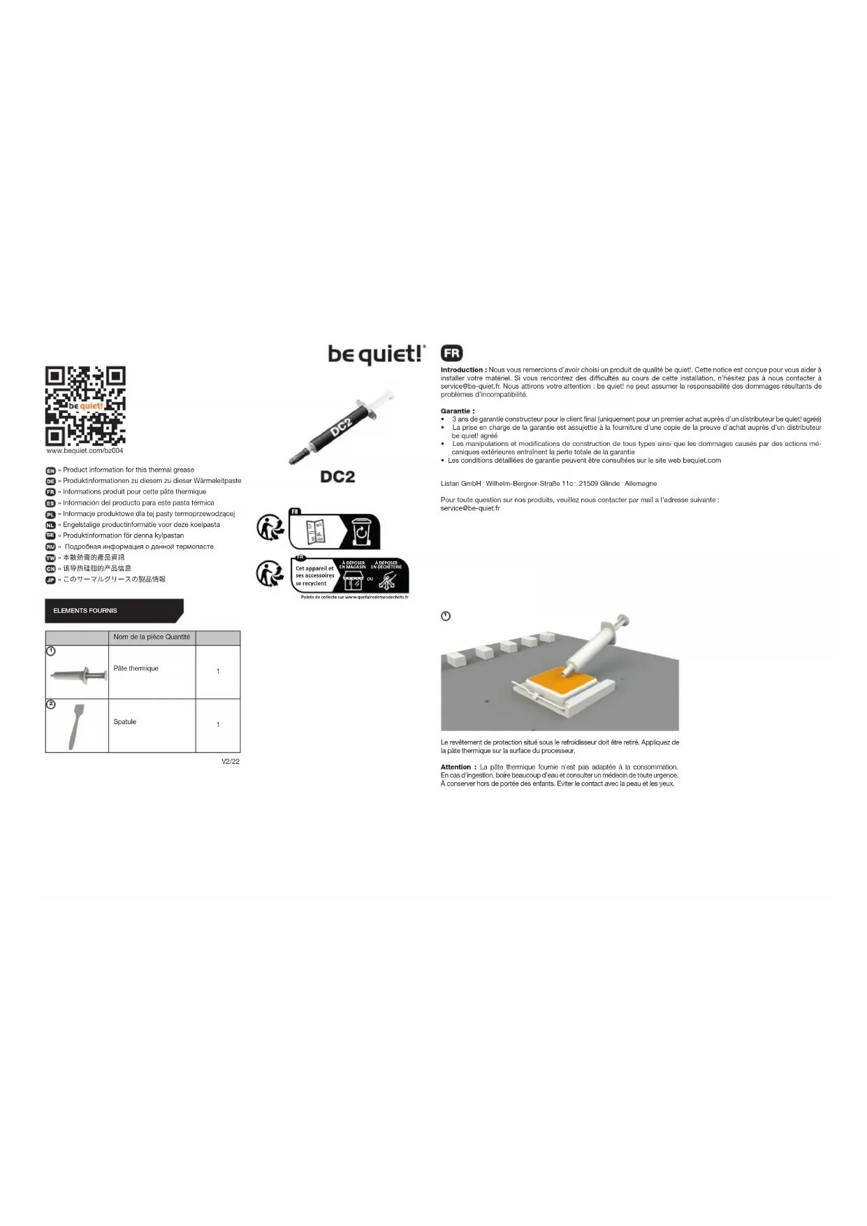 V2/22 » Product information for this thermal grease » Produktinformationen zu diesem zu dieser Wärmeleitpaste » Informations produit pour cette pâte thermique » Información del producto para este pasta térmica » Informacje produktowe dla tej pasty termoprzewodzącej » Engelstalige productinformatie voor deze koelpasta » Produktinformation för denna kylpastan » Подробнаяинформацияоданнойтермопасте » 本散熱膏的產品資訊 » 该导热硅脂的产品信息 » このサーマルグリースの製品情報 Introduction : Nous vous remercions d’avoir choisi un produit de qualité be quiet!. Cette notice est conçue pour vous aider à installer votre matériel. Si vous rencontrez des difficultés au cours de cette installation, n’hésitez pas à nous contacter à service@be-quiet.fr. Nous attirons votre attention : be quiet! ne peut assumer la responsabilité des dommages résultants de problèmes d’incompatibilité. Garantie :