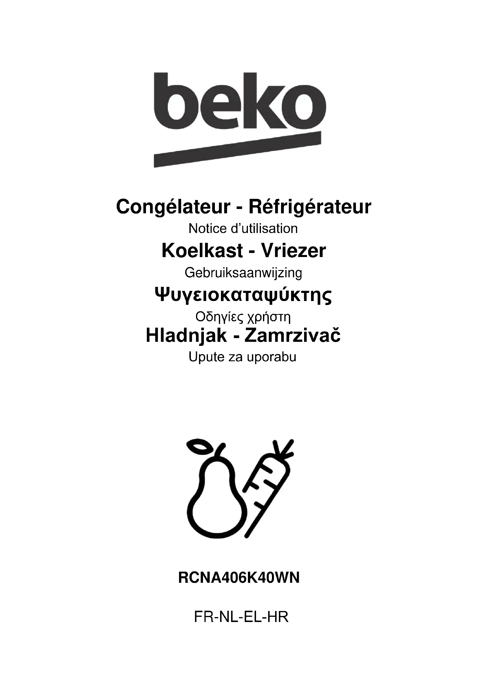 Congélateur - Réfrigérateur Notice d’utilisation Koelkast - Vriezer Gebruiksaanwijzing Ψυγειοκαταψύκτης Οδηγίες χρήστη Hladnjak - Zamrzivač Upute za uporabu FR-NL-EL-HRVeuillez d’abord lire ce manuel d’utilisation ! Cher client, Nous espérons que votre produit, qui a été fabriqué dans des usines modernes et vérifié au terme des procédures de contrôle de qualité les plus méticuleuses, vous rendra satisfaction. Veuillez donc lire attentivement l'intégralité de ce manuel avant de commencer à utiliser le produit et conservez-le manuel comme référence. Si vous remettez cet appareil à quelqu'un d'autre, remettez-lui également le manuel d'utilisation. Le présent manuel vous aidera à utiliser votre produit en toute sécurité et efficacement.