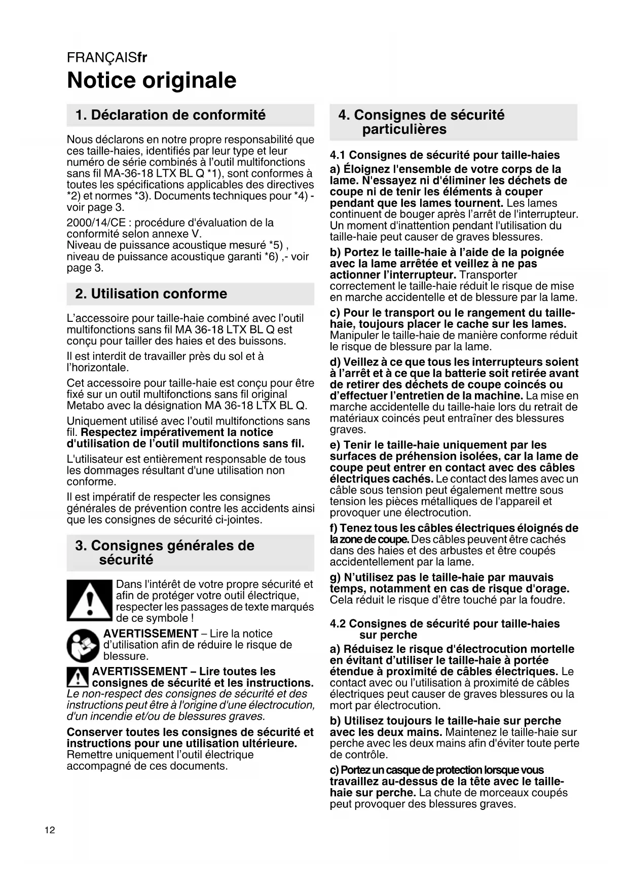 Notice originale Nous déclarons en notre propre responsabilité que ces taille-haies, identifiés par leur type et leur numéro de série combinés à l’outil multifonctions sans fil MA-36-18 LTX BL Q *1), sont conformes à toutes les spécifications applicables des directives *2) et normes *3). Documents techniques pour *4) - voir page 3. 2000/14/CE : procédure d'évaluation de la conformité selon annexe V. Niveau de puissance acoustique mesuré *5) , niveau de puissance acoustique garanti *6) ,- voir page 3. L’accessoire pour taille-haie combiné avec l’outil multifonctions sans fil MA 36-18 LTX BL Q est conçu pour tailler des haies et des buissons. Il est interdit de travailler près du sol et à l’horizontale. Cet accessoire pour taille-haie est conçu pour être fixé sur un outil multifonctions sans fil original Metabo avec la désignation MA 36-18 LTX BL Q. Uniquement utilisé avec l’outil multifonctions sans fil. Respectez impérativement la notice d'utilisation de l’outil multifonctions sans fil. L'utilisateur est entièrement responsable de tous les dommages résultant d'une utilisation non conforme. Il est impératif de respecter les consignes générales de prévention contre les accidents ainsi que les consignes de sécurité ci-jointes. Dans l'intérêt de votre propre sécurité et afin de protéger votre outil électrique, respecter les passages de texte marqués de ce symbole ! AVERTISSEMENT – Lire la notice d’utilisation afin de réduire le risque de blessure. AVERTISSEMENT – Lire toutes les consignes de sécurité et les instructions. Le non-respect des consignes de sécurité et des instructions peut être à l'origine d'une électrocution, d'un incendie et/ou de blessures graves. Conserver toutes les consignes de sécurité et instructions pour une utilisation ultérieure. Remettre uniquement l’outil électrique accompagné de ces documents.