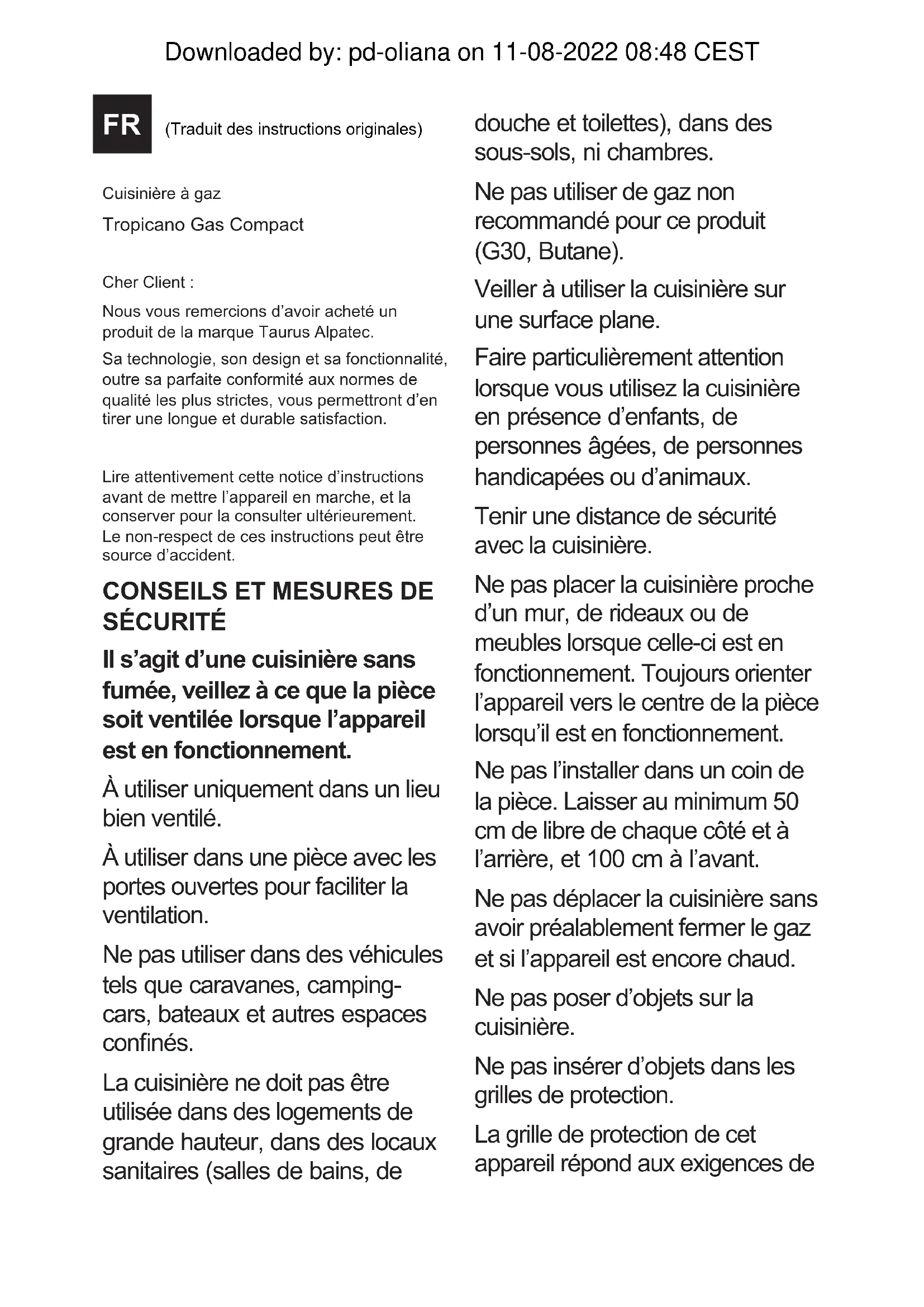 SÉCURITÉ Il s’agit d’une cuisinière sans fumée, veillez à ce que la pièce soit ventilée lorsque l’appareil est en fonctionnement. À utiliser uniquement dans un lieu bien ventilé. À utiliser dans une pièce avec les portes ouvertes pour faciliter la ventilation. Ne pas utiliser dans des véhicules tels que caravanes, camping- cars, bateaux et autres espaces connés. La cuisinière ne doit pas être utilisée dans des logements de grande hauteur, dans des locaux sanitaires (salles de bains, de douche et toilettes), dans des sous-sols, ni chambres. Ne pas utiliser de gaz non recommandé pour ce produit (G30, Butane). Veiller à utiliser la cuisinière sur une surface plane. Faire particulièrement attention lorsque vous utilisez la cuisinière en présence d’enfants, de personnes âgées, de personnes handicapées ou d’animaux. Tenir une distance de sécurité avec la cuisinière. Ne pas placer la cuisinière proche d’un mur, de rideaux ou de meubles lorsque celle-ci est en fonctionnement. Toujours orienter l’appareil vers le centre de la pièce lorsqu’il est en fonctionnement. Ne pas l’installer dans un coin de la pièce. Laisser au minimum 50 cm de libre de chaque côté et à l’arrière, et 100 cm à l’avant. Ne pas déplacer la cuisinière sans avoir préalablement fermer le gaz et si l’appareil est encore chaud. Ne pas poser d’objets sur la cuisinière. Ne pas insérer d’objets dans les grilles de protection. La grille de protection de cet appareil répond aux exigences de Downloaded by: pd-oliana on 11-08-2022 08:48 CESTla réglementation. Elle n’apporte pas une protection complète pour les jeunes enfants ou les personnes malades. La protection sert à éviter le risque de lésions. Elle ne peut être retirée ni altérée. Ne pas utiliser la cuisinière pour sécher des vêtements, tissus ou autres matériaux. De plus, ne jamais mettre ces éléments devant la grille. Ne placer aucun récipient avec de l’eau sur la cuisinière. Ne pas utiliser la cuisinière si une de ses parties a été en contact avec de l’eau ou dans des situations à humidité élevée. Dans ce cas, consulter un technicien autorisé. En cas de mauvais fonctionnement, consulter toujours un technicien spécialisé autorisé. Ne pas stocker ni utiliser de matériaux ni de liquides inammables à proximité de la cuisinière. En cas de fuite, l’alimentation en gaz de l’appareil devra être coupée à l’aide de la vanne de la bouteille de gaz. Ne pas exposer la bouteille plein soleil en été, ni très proche d’une source de chaleur. Ne pas placer la cuisinière en fonctionnement proche de rideaux, meubles, panneaux en bois ou matières combustibles qui puissent se détériorer avec la chaleur. Ne pas utiliser dans des chambres durant le sommeil, ni dans aucune pièce où quelqu’un dort. Ne pas exposer aux agents atmosphériques. Durant le fonctionnement, éviter que les jeunes enfants ne s’approchent de la cuisinière. Veiller à ce qu’ils ne jouent pas avec. Faire attention et vérier que le tuyau de gaz ne soit pas plié en excès, au point d’éviter le transit du gaz. Fermer le passage du gaz lorsque la cuisinière n’est pas en fonctionnement. Respecter soigneusement les conditions d’installation et si vous sentez une odeur de gaz : - Fermer le passage de gaz au niveau du régulateur de la bouteille. - Ouvrir les fenêtres. N’allumer aucun interrupteur et éteindre tout type de amme. Consulter un technicien autorisé. Ne pas mettre la bouteille en Downloaded by: pd-oliana on 11-08-2022 08:48 CESTposition horizontale. Si la cuisinière s’éteint automatiquement, ne pas la rallumer immédiatement. Faire entrer de l’air nouveau et frais dans la pièce. Si le problème persiste, consulter le service technique. Ne jamais utiliser l’aspirateur, souer, ni verser de liquide sur le panneau catalytique. Tout nettoyage du panneau catalytique ou des composants de sécurité doit être eectué par un personnel autorisé. Vérier régulièrement l’état du exible de gaz et sa date d’expiration. Ne jamais utiliser de tuyaux ou de régulateurs de gaz qui ne répondent pas aux normes en vigueur. Consulter un service technique en cas de doute. Remarque : La cuisinière possède plusieurs dispositifs de sécurité qui lui permet de s’éteindre en cas de conditions dangereuses :