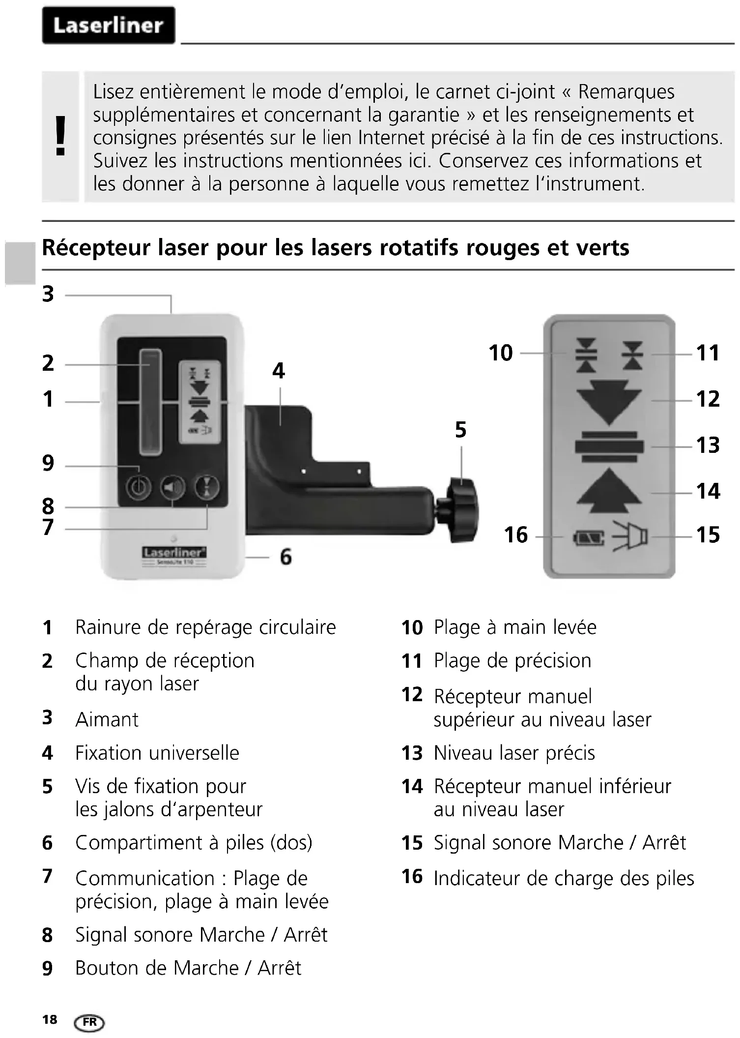 Rainure de repérage circulaire Champ de réception du rayon laser Aimant Fixation universelle Vis de fixation pour les jalons d‘arpenteur Compartiment à piles (dos) Communication : Plage de précision, plage à main levée Signal sonore Marche / Arrêt Bouton de Marche / Arrêt Plage à main levée Plage de précision Récepteur manuel supérieur au niveau laser Niveau laser précis Récepteur manuel inférieur au niveau laser Signal sonore Marche / Arrêt Indicateur de charge des piles
