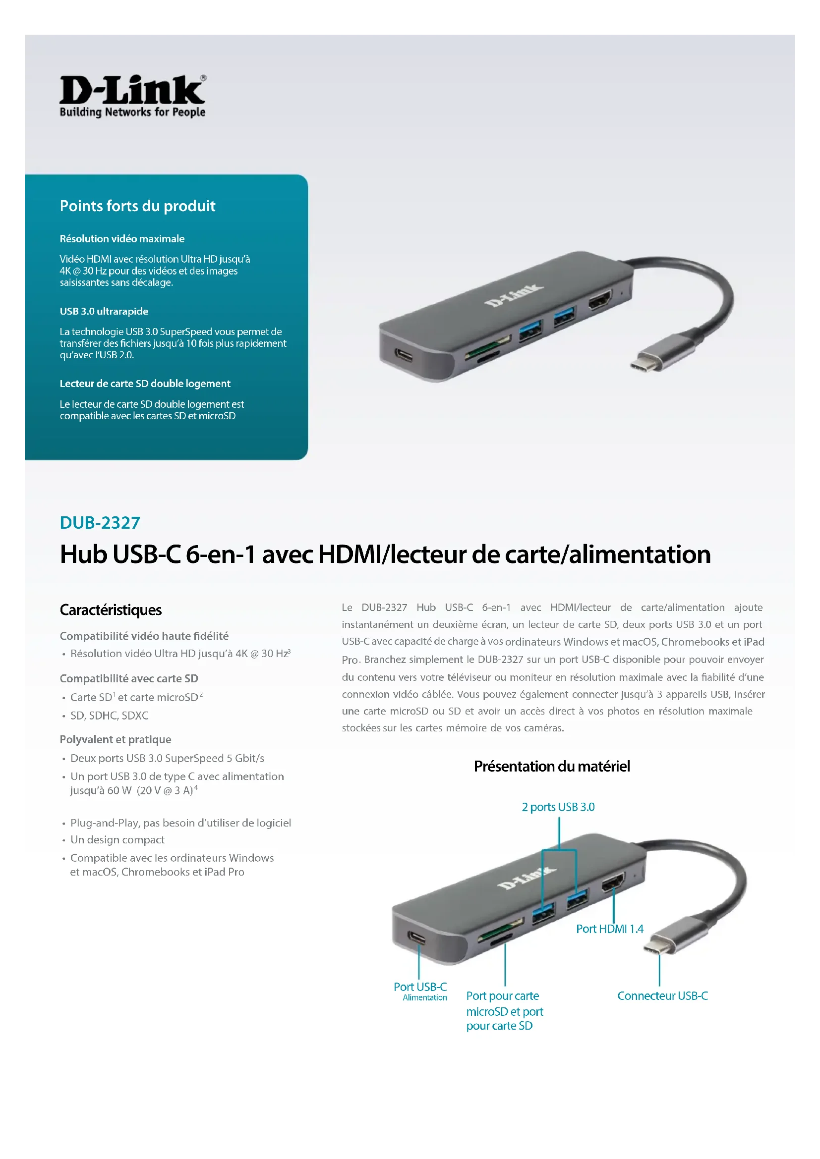 - Compatible avec les ordinateurs Windows et macOS, Chromebooks et iPad Pro Résolution vidéo maximaleVidéo HDMI avec résolution Ultra HD jusqu’à 4K @ 30 Hz pour des vidéos et des images saisissantes sans décalage.USB 3.0 ultrarapideLa technologie USB 3.0 SuperSpeed vous permet de transférer des chiers jusqu’à 10fois plus rapidement qu’avec l’USB 2.0.Lecteur de carte SD double logement Le lecteur de carte SD double logement est compatible avec les cartes SD et microSD Points forts du produit Port HDMI 1.4 Connecteur USB-C Port USB-C Alimentation Port pour carte microSD et port pour carte SD 2ports USB 3.0DUB-2327 Hub USB-C 6-en-1 avec HDMI/lecteur de carte/alimentation D-Link (Allemagne) GmbH, Schwalbacher Strasse 74, 65760 Eschborn, Allemagne D-Link (Europe) Ltd, Artemis Building, Odyssey Business Park, West End Road, South Ruislip HA4 6QE, Royaume-Uni Les spécications peuvent être modiées sans préavis. D-Link est une marque commerciale déposée de D-Link Corporation et de ses liales étrangères. Toutes les autres marques commerciales appartiennent à leurs propriétaires respectifs. ©2019 D-Link Corporation. Tous droits réservés. Sauf erreur ou omission. Dernière mise à jour avril 2022 Pour en savoir plus: eu.dlink.com Spécications techniques Connectivité Interfaces • Un connecteur USB de type C